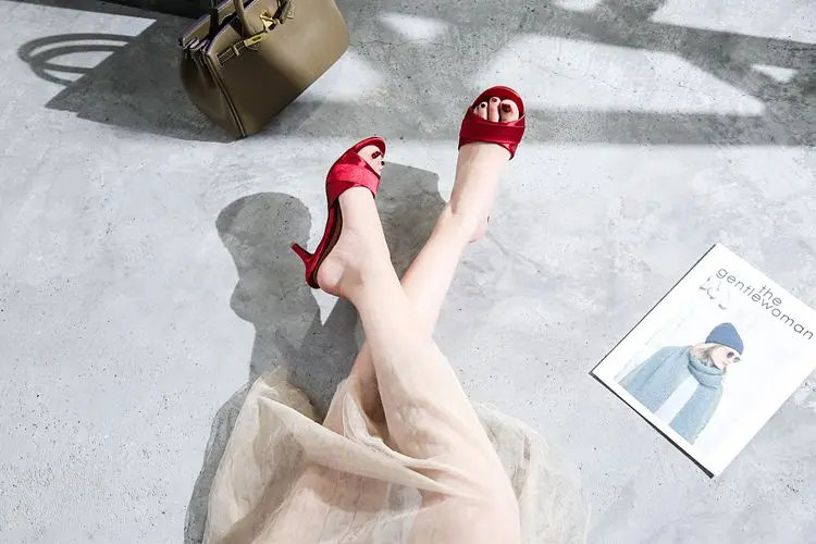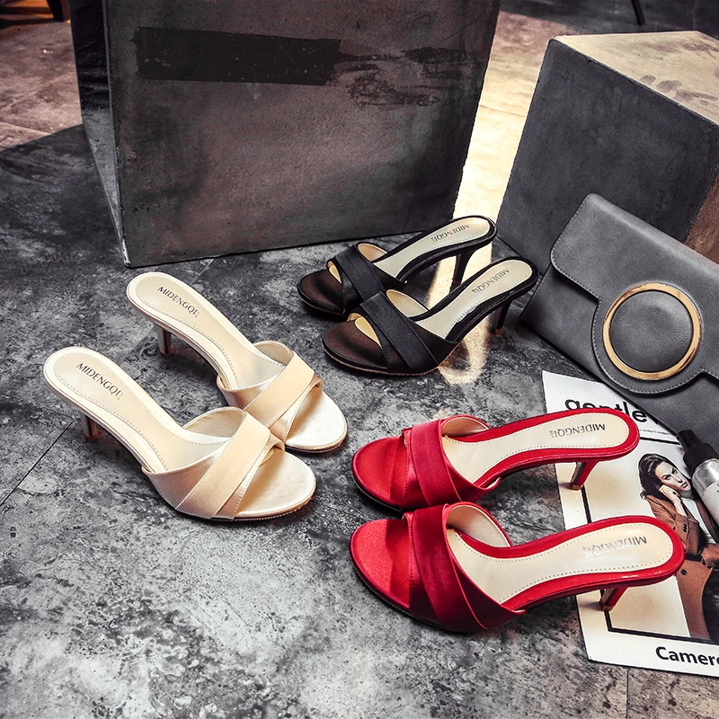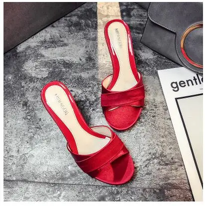 Шлепанцы 2019 г. Летние тонкие шлепанцы на высоком каблуке из шелка и сатина пикантные босоножки с ремешком декоративные тапочки 41, 42, 43 размер