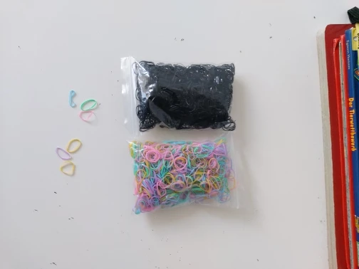 Пластиковый карман на молнии со многими цветными резинами, как и описание. Точное количество резин я не знаю, потому что я их не посчитал, но их много. Доволен покупкой.