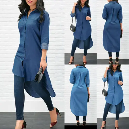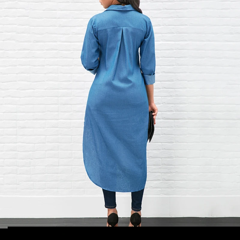 Летняя женская мода, крутая синяя джинсовая рубашка, простая, на кнопках, с отложным воротником, с длинным рукавом, повседневная, свободная, рубашка, платье