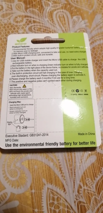 Материал корпуса: высококачественный огнестойкий абс пластиковый корпус + медный электродТип батареи: A + литий-полимерный аккумуляторВход: Micro USB (5 В)Выход: 1,5 VНапряжение зарядки: 5 ВЕмкость аккумулятора: 600 мАчМаксимальный выходной ток: менее 1 АМаксимальный входной ток: менее 300 мАЭнергоемкость: 0.66WhСрок службы батареи: > 3000 разВремя зарядки: 0,5 часовСовместимость: аккумулятор AAA/LR03Размер: 10 мм * 45 ммУпаковка продукта: 1 шт. перезаряжаемая батарея