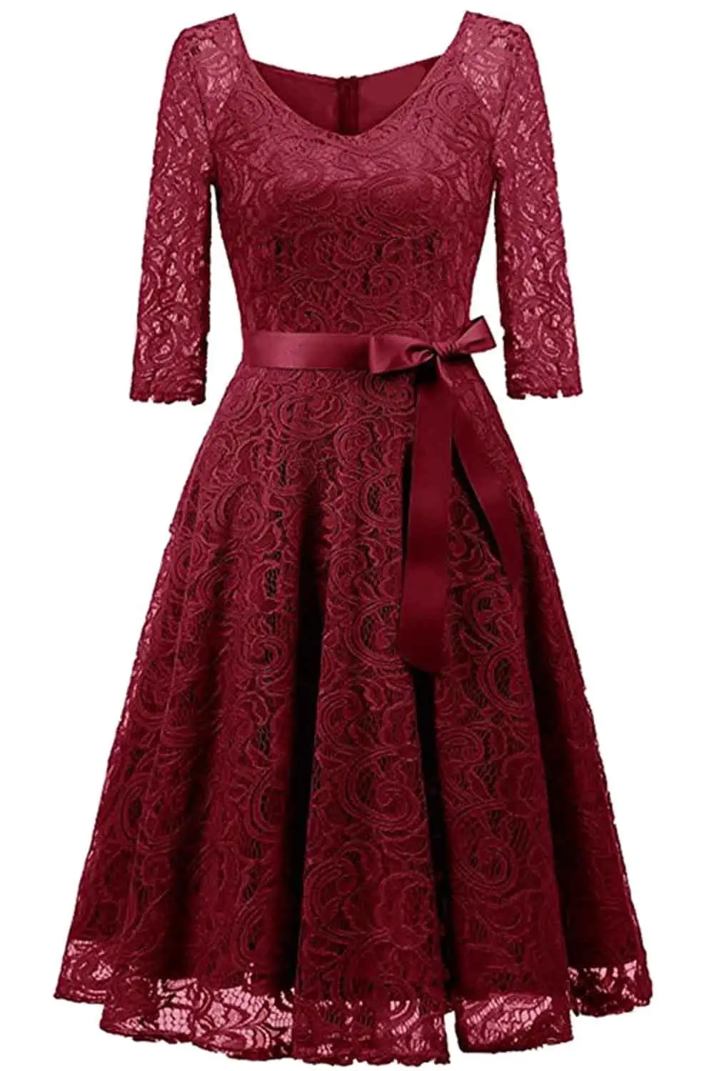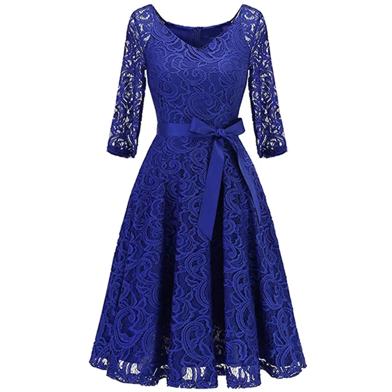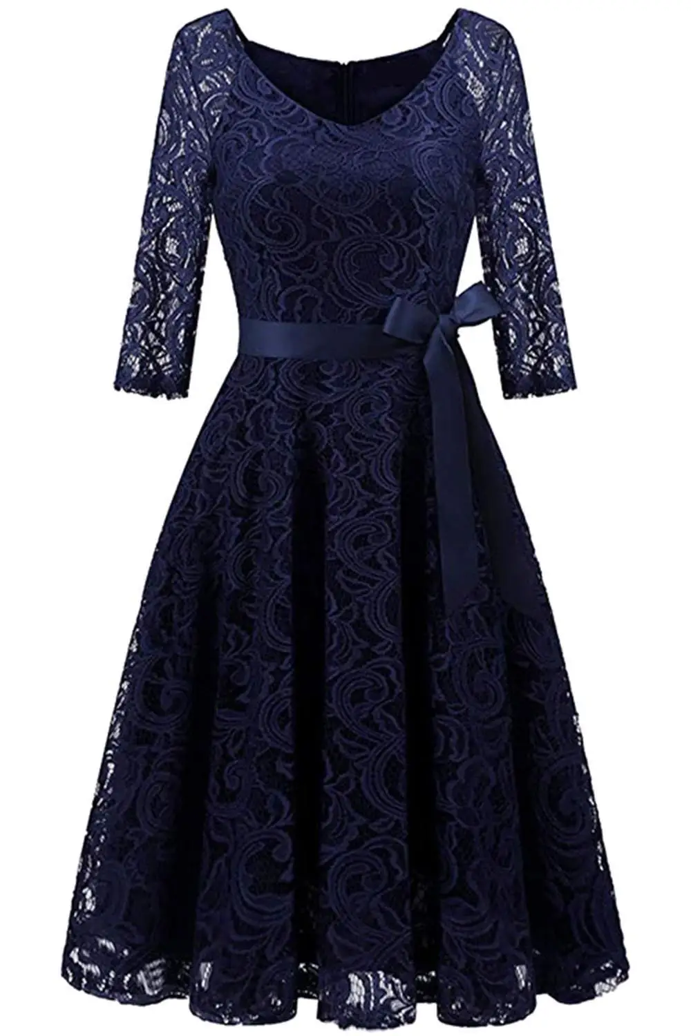 Элегантное Королевское синее кружевное короткое вечернее платье с V-образным вырезом, рукавом до локтя, а-силуэт, вечернее платье с поясом