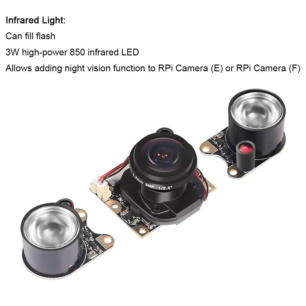 Камера ночного видения для Raspberry Pi поставляется со светодиодной инфракрасной подсветкой. Он имеет инфракрасный режим ночного видения, с внешними инфракрасными фотографическими лампами высокой мощности 3 Вт, может очень хорошо формироваться даже в условиях слабого освещения.