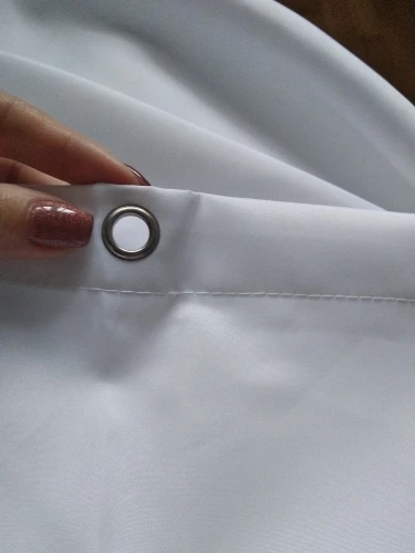 Штора класс! Белоснежная с металлическими обметками петель и кольцами в комплекте (14 шт.). Искал широкую и вот она. Рекомендую.
