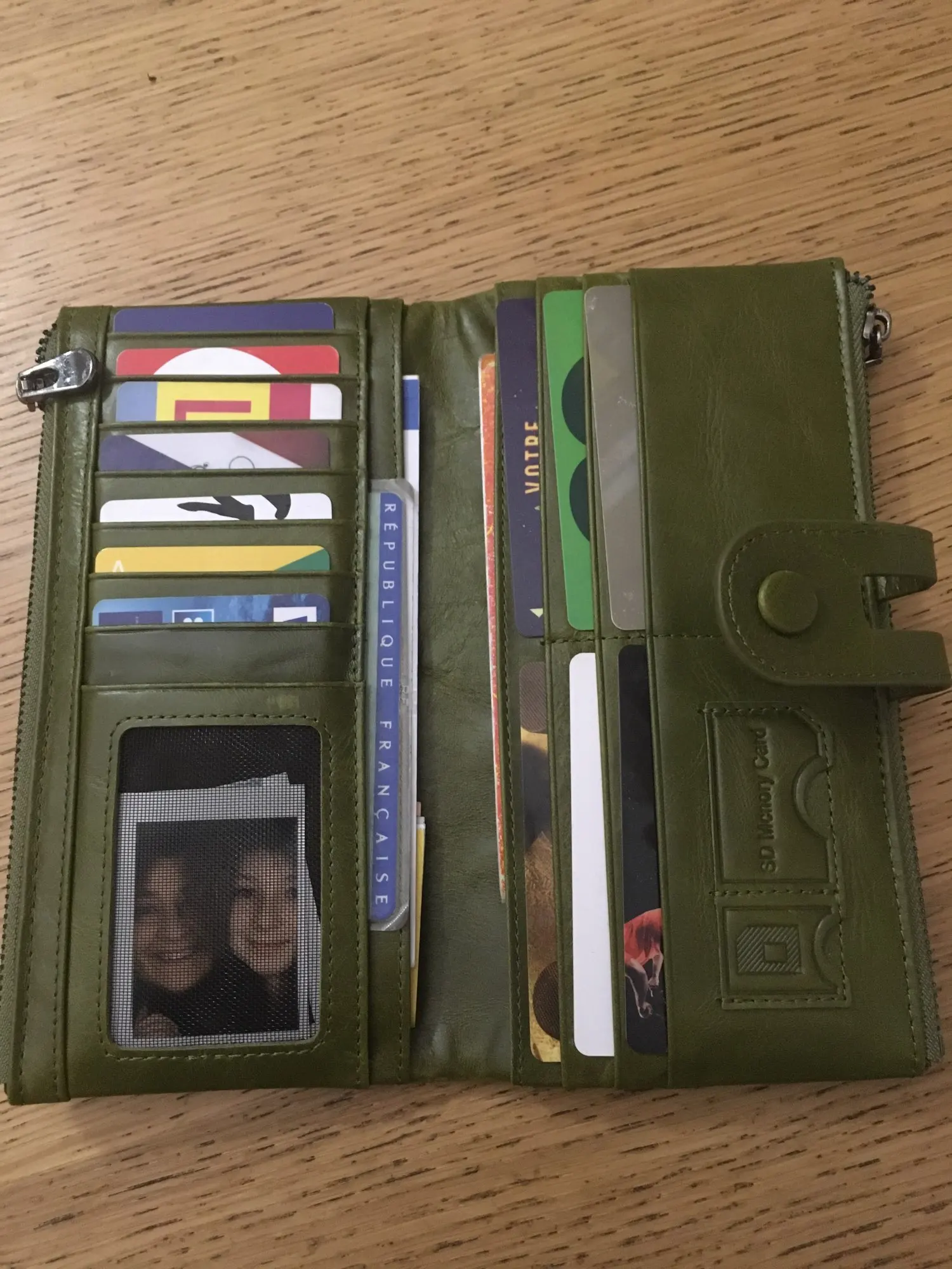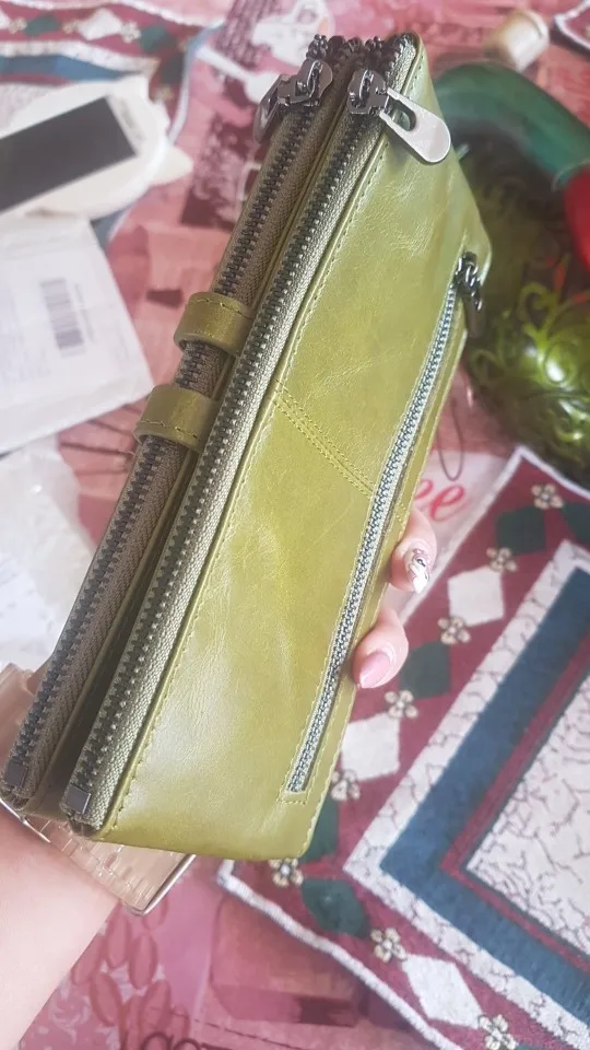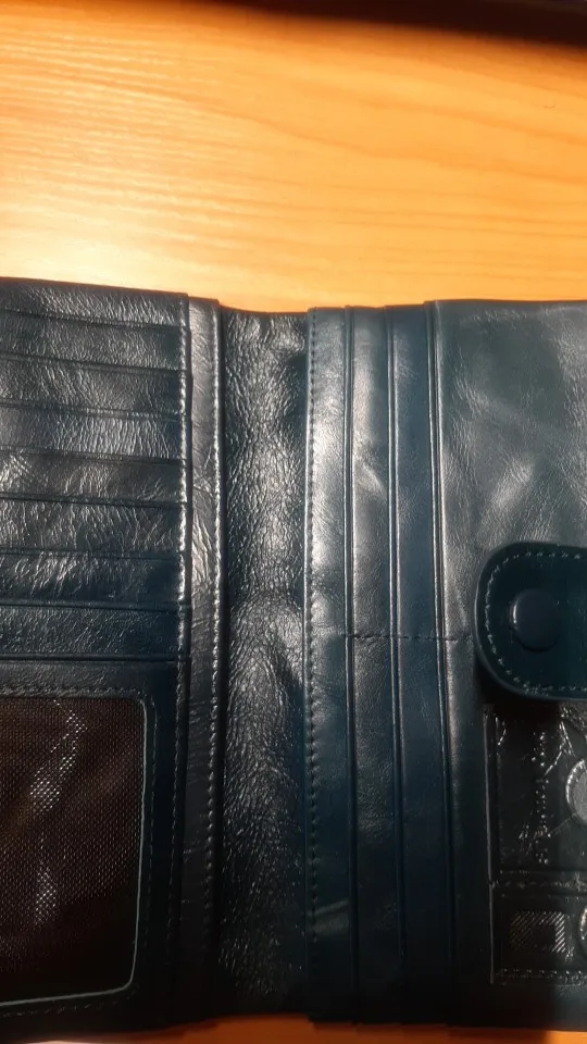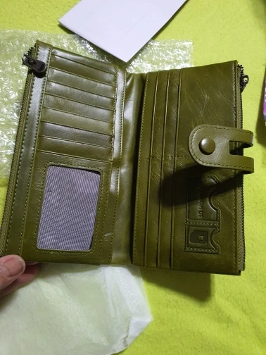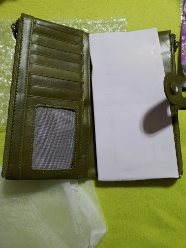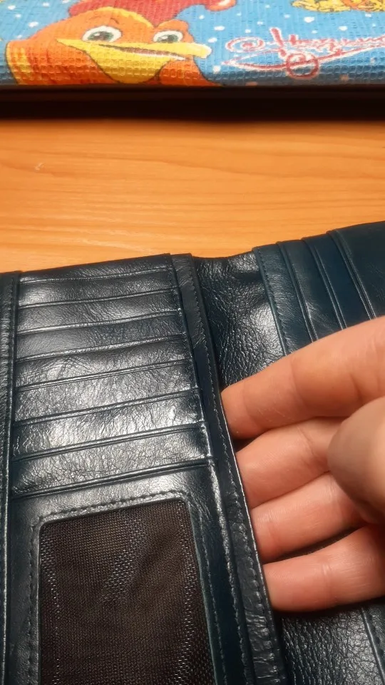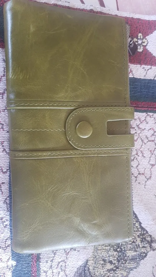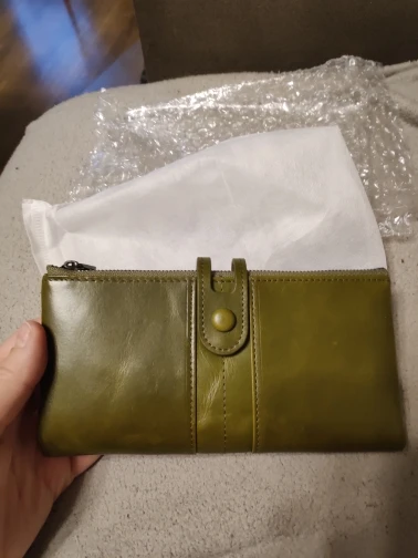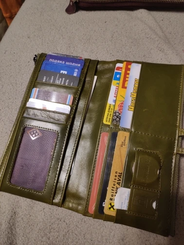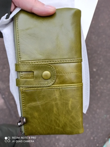 На фото кошелёк коричневый, а по факту пришел зелёный, нам был не важен цвет, поэтому норм.
