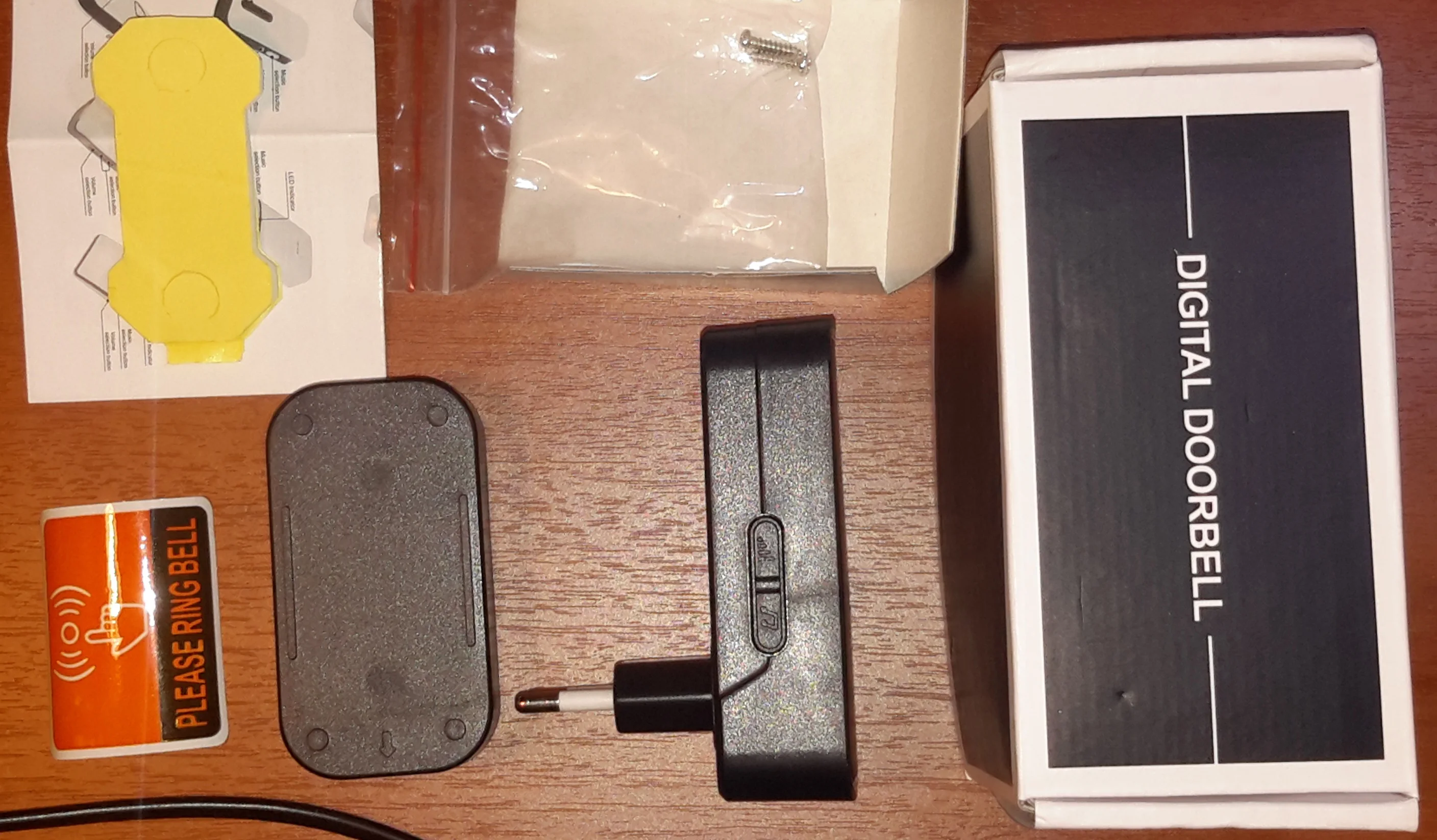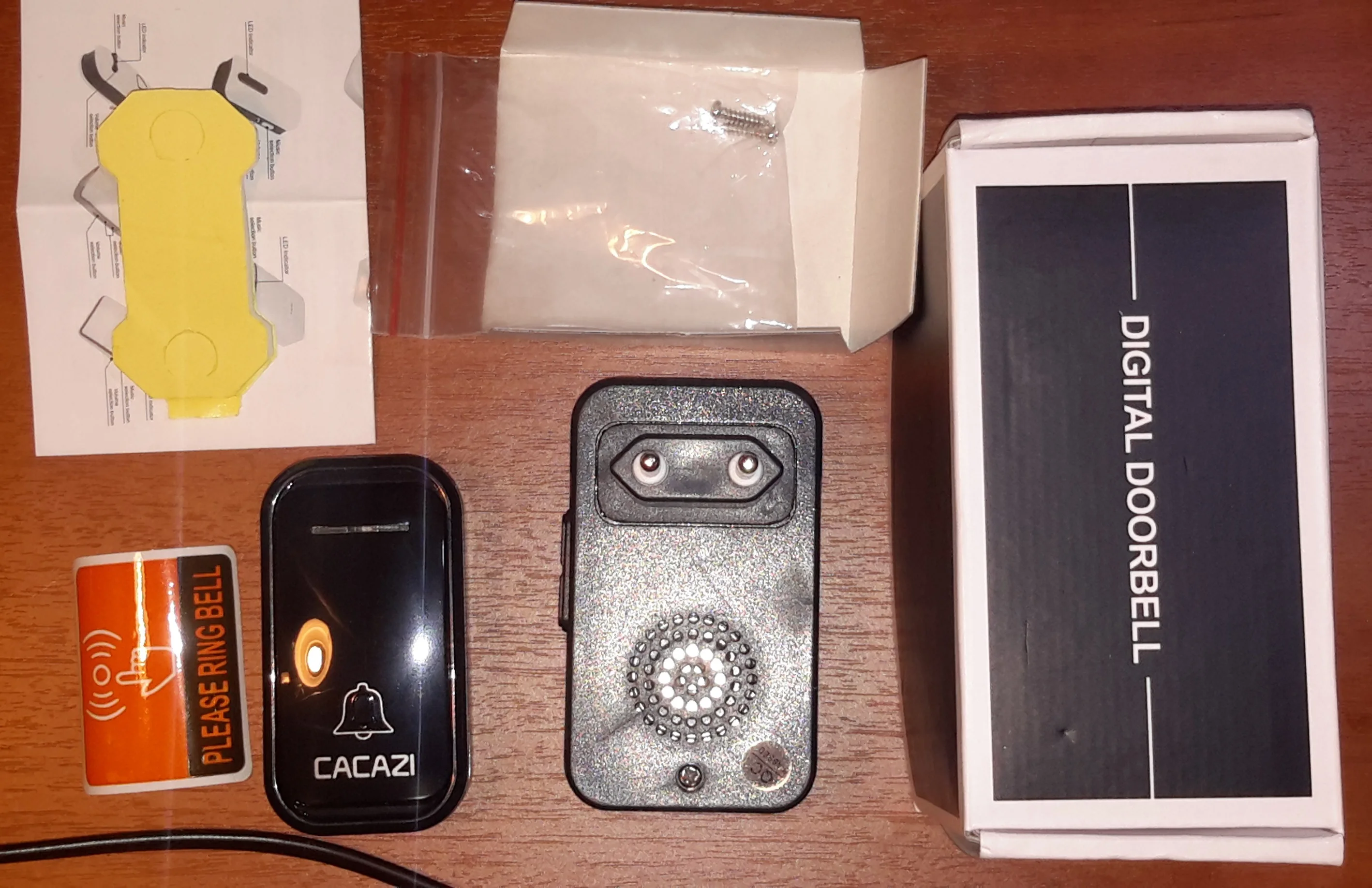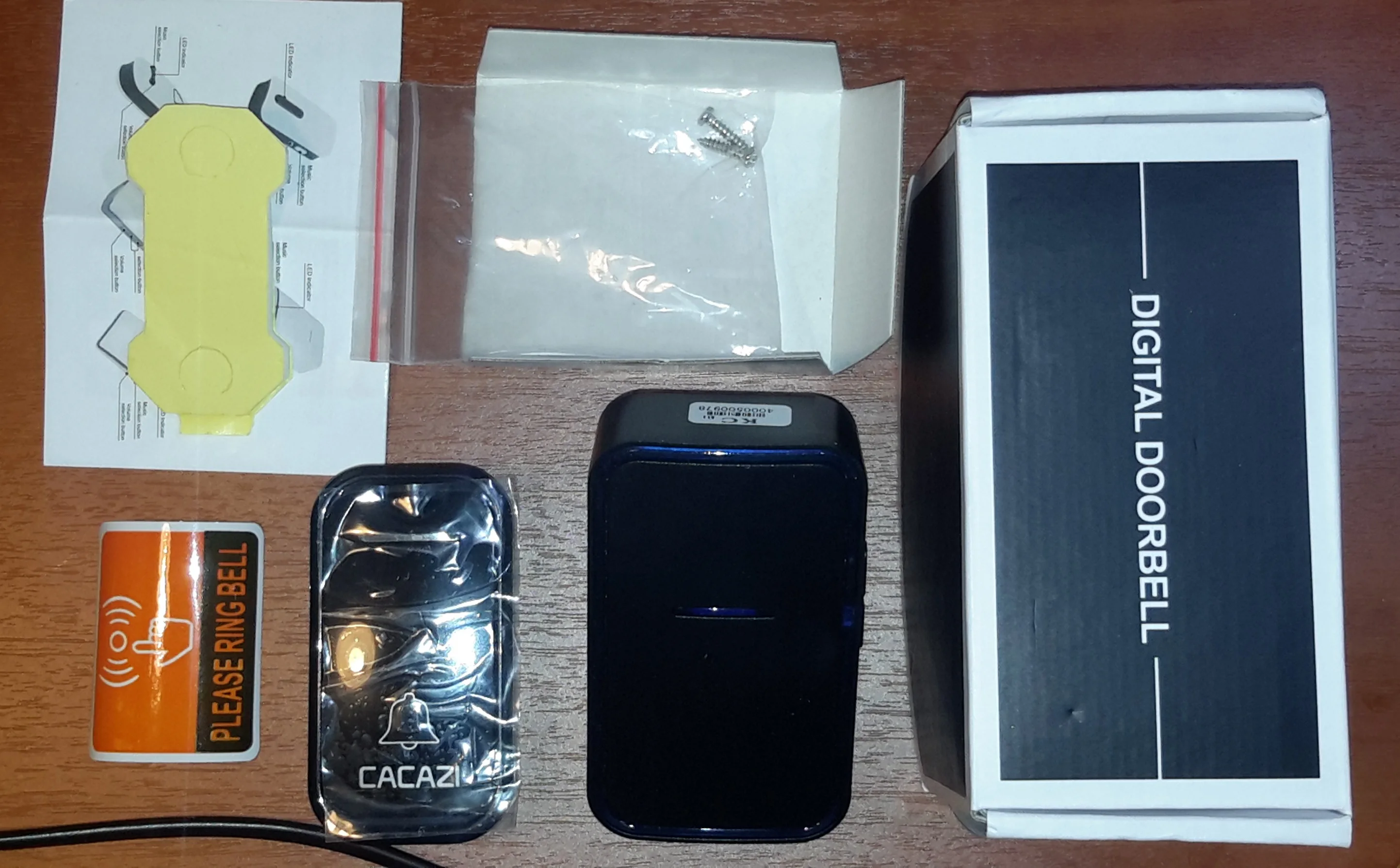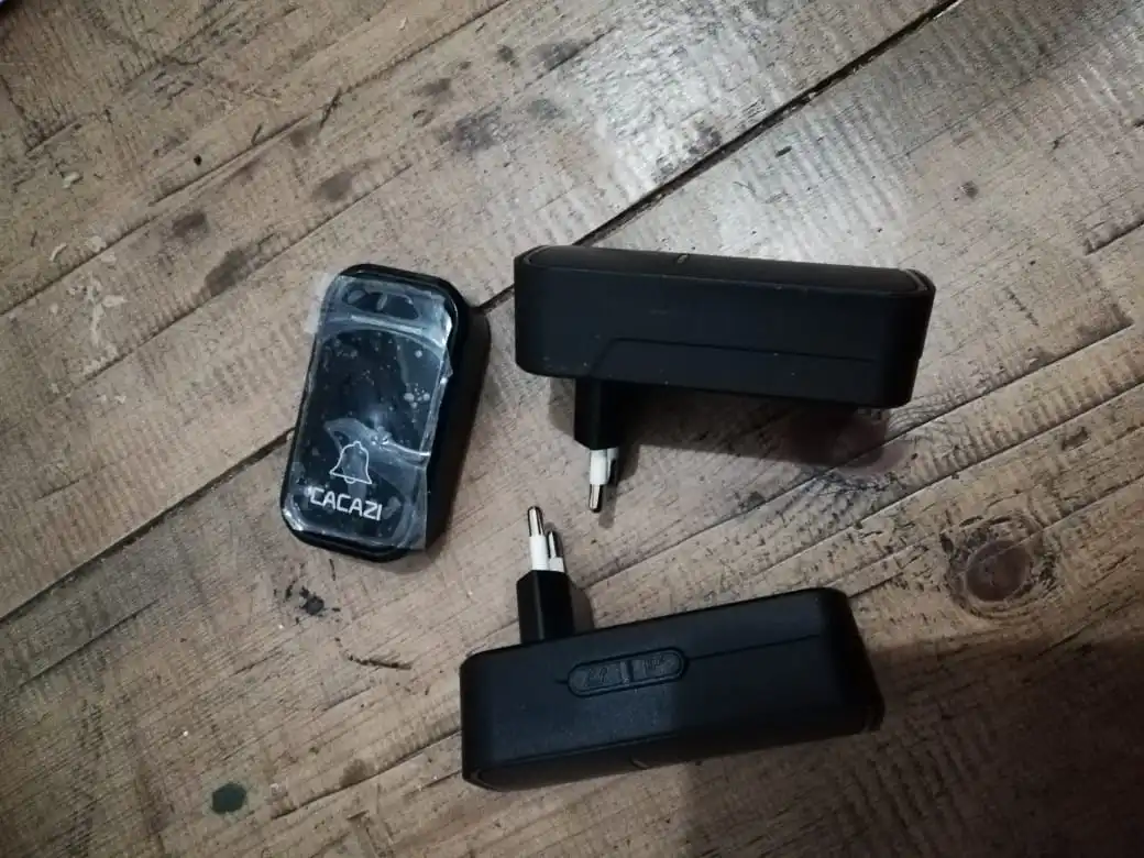 Прилетело мигом, это хорошо. В заказе три звонка и одна кнопка. Но один звонок не реагировал. В инструкции об этом ни слова, но методом прямого тыка удалось всё это дело состыковать так: надо долго держать кнопку на звонке, пока не услышится необычный звук, затем нажать на уличную кнопку. Дальность зависит от помех, но точно никак не 200 метров. Хотя пару кирпичных стен пробивает. Для самодельщиков можно вывести наружную антенну что повысит дальность в разы.