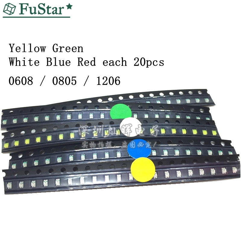 100 шт. = 5 цветов x 20 шт. 1206 0805 0603 светодиодный Диод ассортимент SMD светодиодный Диод комплект зеленыйкрасныйбелыйсинийжелтый светодиодный чип