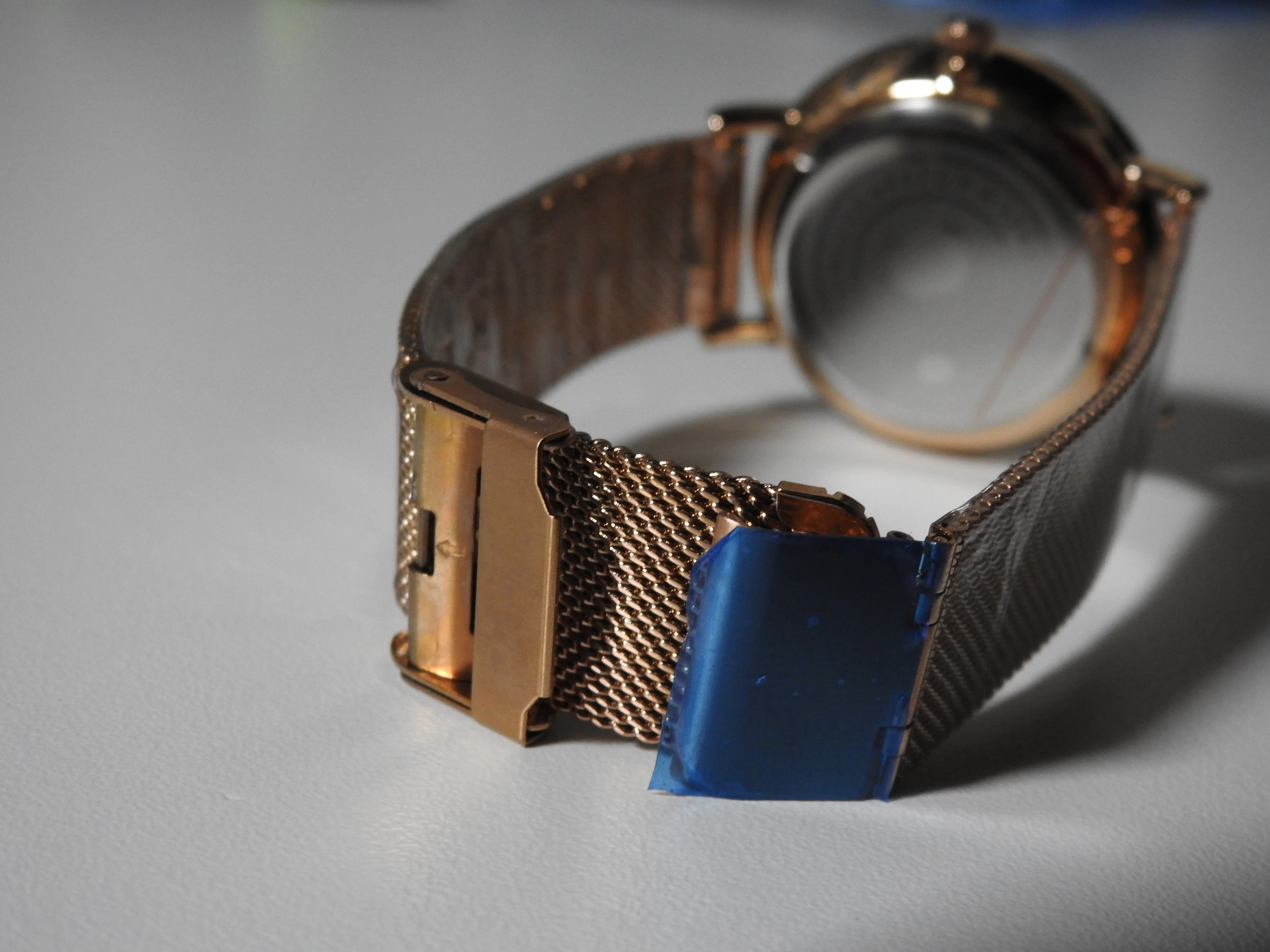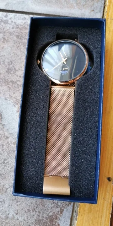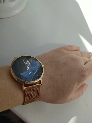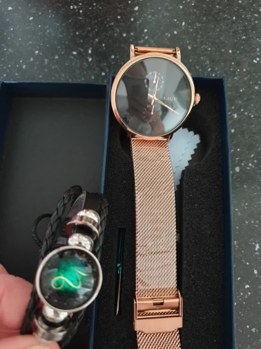 доставка была не совсем быстрая, около полутора месяцев, было бы но слава богу я заказывала себе) благодаря внутренней упаковке ничего не разбилось. часы отличные тяжёлые достаточно, огромный плюс того что ремешок регулируется, буду надеяться что браслет не потеряет свой цвет, на руке смотрятся очень здорово, выглядят стильно
