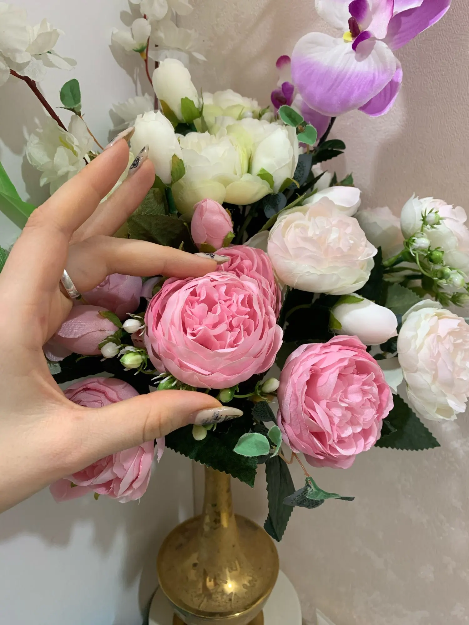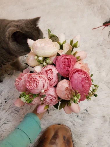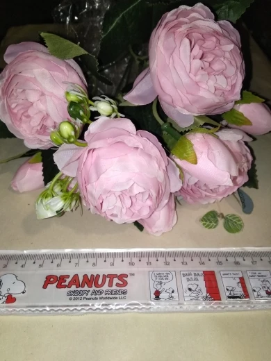 Очень милые, приятные букетики, но маленькие! Длина такого букета 30см от самаго верхнего бутона до основания, сами бутоны +/- 7см. Букет не пышный, я бы даже сказала, скромный. Поэтому я заказала 2 букета. По количеству всех бутонов получается нормальное нечетное число)). В случае с этим букетом цвет очень близок к тому, что заявлен продавцом. Нежно розовый, даже бедного розового оттенка и каждый бутон окружён лепестками бледно зелёного оттенка. В любом случае мне понравились эти пионы. Качество товара хорошее, запах немного есть, но совсем еле уловимый, скорее всего выветриется. Отличное дополнение декора в интерьере и фото зоны. Рекомендую этот товар. Время в пути около 2х нед. Забрала на почте.