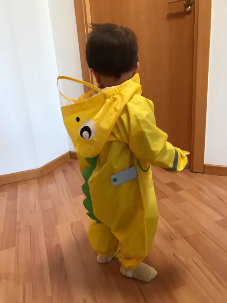 Очень симпатичный дождевик. Как в описании. В действии еще не пробовали. Заказывала размер 80-89, дождевик пришел гораздо большего размера. Будет на вырост.
