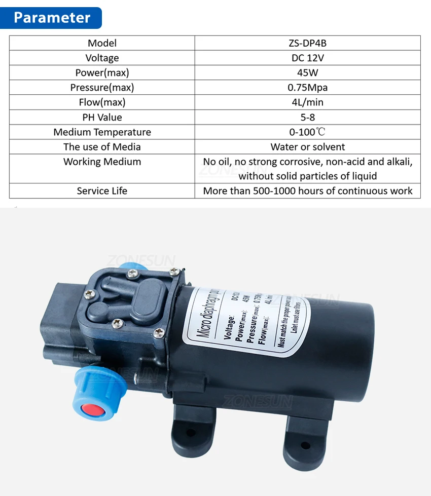Мембранный Водяной насос ZONESUN для разливочной машины, маленький безопасный самовсасывающий насос высокого давления, 3,6 лмин