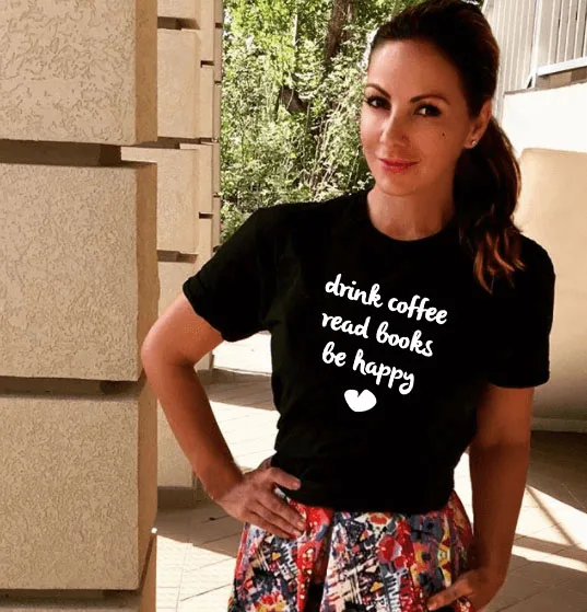 Женская футболка с надписью DRINK COFFEE и принтом BE HAPPY, Повседневная хипстерская футболка с забавными цитатами для девочек, футболки Tumblr, Прямая поставка