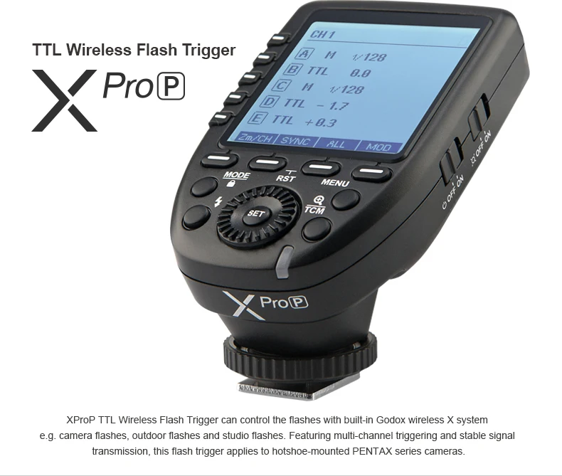 Беспроводной триггер вспышки Xpro-C TTL может не только управлять вспышками со встроенной системой Godox Wireless X, e g. Вспышки камеры, наружные вспышки и студийные вспышки, но также могут управлять оригинальными вспышками пушки при использовании в комбинации с X1R-C приемником. Благодаря многоканальному запуску и стабильной передаче сигнала, этот триггер для вспышки применяется к камерам серии Canon E0S с креплением на горячий башмак.Встроенный Godox 2,4G беспроволочная X система и универсальные методы использования-Можно как Беспроводной Godox вспышка триггера/Беспроводной Canon Speedlite вспышка триггера/Беспроводной спуском фотографического затвора триггер/триггера для вспышки с 2,5 мм кабель синхронизацииПоддержка E-TTL II Autoflash и профессиональных функций-16 групп и 32 канала для беспроводного управления и запуска. Добавьте настройки беспроводного идентификатора 01-99, что может достигать срабатывания только тогда, когда каналы и беспроводные идентификаторы главного и подчиненного блока настроены таким же образом, эффективно избегая помех сигнала.-Полностью поддерживает TTL autoflash. Высокоскоростная синхронизация 1/8000s, многократная вспышка, ручная вспышка, компенсация экспозиции вспышки, функция преобразования TCM, функция увеличения, настройка «one-shoot» и «multi-shcx», групповое Моделирование управления лампой, групповое масштабирование, регулировка всех выходных значений groups1 одновременно и т. Д.Выдающийся дизайн, простота в эксплуатации и отличная портативность-Экстра-большая ЖК-панель, 5 групповых кнопок и 4 функциональных кнопки обеспечивают удобную манипуляцию.-Xpro-C довольно портативный, для него весит всего 80 г-Поддерживающий Тип-C USB обновление прошивки и беспроводной Запуск по 2,5 мм кабель синхронизации.Godox Xpro триггер всех серий:Xpro-C:1Dx MarkII, 1Dx, 5Ds/5Dsr, 5DIV, 5D MarkII, 5D MarkII, 7D MarkII, 7D MarkII, 7D, 6D, 80D, 70D, 60D, 50D, 40D, 30D, 750D/60D, 60D 700D, 650D, 600D, 550D, 500D, 450D, 400D Digital, 350D DIGITAL, 100D, 1200D, 1000D, 1100D, M5, M3Xpro-N:D5, D4, D60, D70S, D90, D100, D200, D300S, D300, D500, D610, D700, D750, D800, D810, D3100, D3200, D3300, D5000, D5100, d5200, D5300, D7000, D7100Xpro-S:A77lI, a77, a99, ILCE-6000L, a9, A7R, A7Rlll, a350, DSC-RX10Xpro-F: (различные модели поддерживают различные функции.)1. GFX50S, X-Pro2, X-T20, X-T2,X-T12. X-Pro1, X-T10, X-E1,X-A33. X100F,X100TXpro-O:PEN-F, E-P3, E-P5, E-PL5, E-PL6, E-PL7, E-PL8, E-M1, E-M10II.DMC-G85, DMC-GH4, DMC-GF1, DMC-GX85, DMC-LX100, DMC-FX2500GKXPro-P:Для Pentax K-1, 645Z, K70, K50, KP, K-S2, K-3 IIМодель: Xpro-CСовместимые камеры: для камер Canon EOS (E-TTL II autoflash) поддержка камер с разъемом для синхронизации ПК.Источник питания: 2 * батарейки типа ААКонтроль экспозиции вспышки: E-TTL IIРучная Вспышка: ДаСтробоскопическая вспышка: ДаВысокоскоростная синхронизация: ДаСекундная синхронизация: ДаКомпенсация экспозиции вспышки: Да. ± 3 остановки с шагом 1/3 остановкиБлокировка вспышки: ДаПомощь в фокусировке: ДаМоделирующая лампа: Управляйте модельной лампой с помощью триггера вспышкиПчеловод: Управляйте пчеловодом с помощью триггера вспышкиБеспроводная Настройка: конец приемника может управлять камеройНастройка зума: Отрегулируйте значение зума передатчикомОбновление прошивки: обновление через usb-порт Type-CФункция памяти: настройки будут храниться через 2 секунды после последнегоДиапазон передачи (прибл.): 0-100 мВстроенный беспроводной: 2,4GРежим модуляции: MSKКанал: 32Беспроводной идентификатор: 01-99Группа: 16Дисплей: большая ЖК-панель, Подсветка ВКЛ. Или ВЫКЛ.Размер: 90x58x50ммВес: 80 г