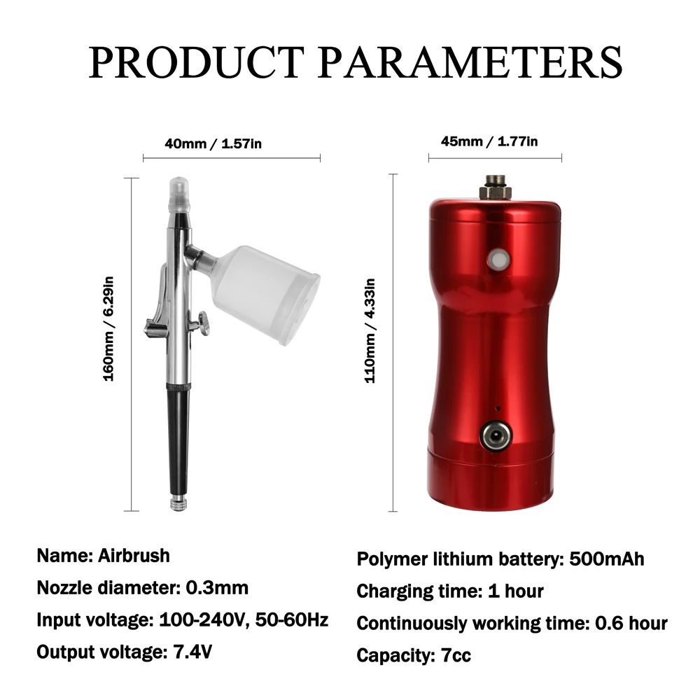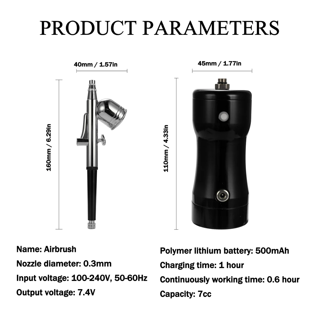 Характеристики:Название: аэрографДиаметр сопла: 0,3 ммВходное напряжение: 100-240 В, 50-60 ГцВыходное Напряжение: 7,4 ВПолимерный литиевый аккумулятор: 500 мАчВремя зарядки: 1 часНепрерывно рабочее время: 0,6 часЕмкость: 7ccМаксимальное давление: 17.00psiПоток воздуха: 7-7 л/минРабочее давление: 8-9psiВоздушный компрессор размер: 110*45*45 мм/4,33*1,77 * 1.77inРазмер ручки: 155*50*27 мм/5,06*2,56 * 1.06inВес воздушного компрессора: 224 г/7,90 унцияВес ручки: 91 г/3,21 унцияРазмер посылка: 185*165*60 мм/7,28*6,50*2,36 дюймовПосылка Вес: 443 г/0.98lb