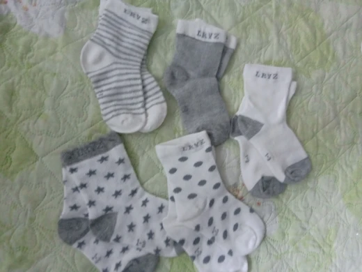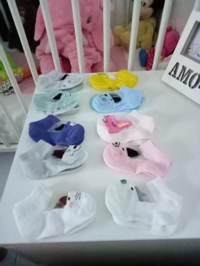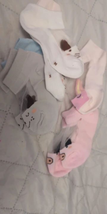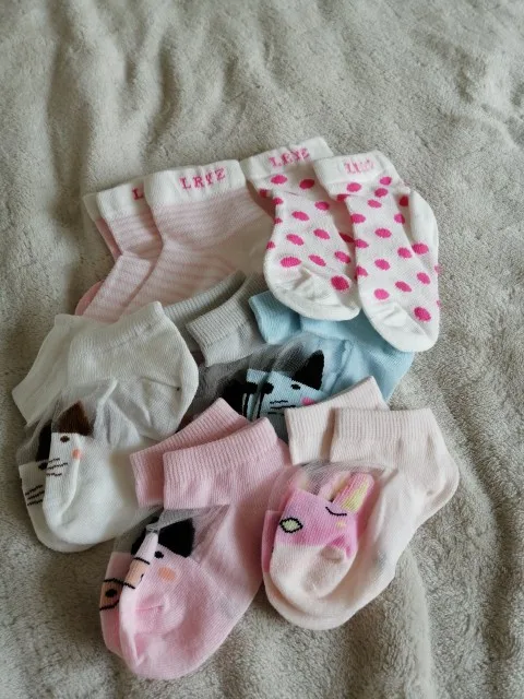 Хорошенькие носочки, тоненькие как раз на лето! Пяточка удобная, не спадают. Размер 4-6 думаю на ножку до 16-16,5см. Нам пока великоваты, брала на вырост. Аналогичные проносили лето, стирала много раз, всё отлично, не испортились!