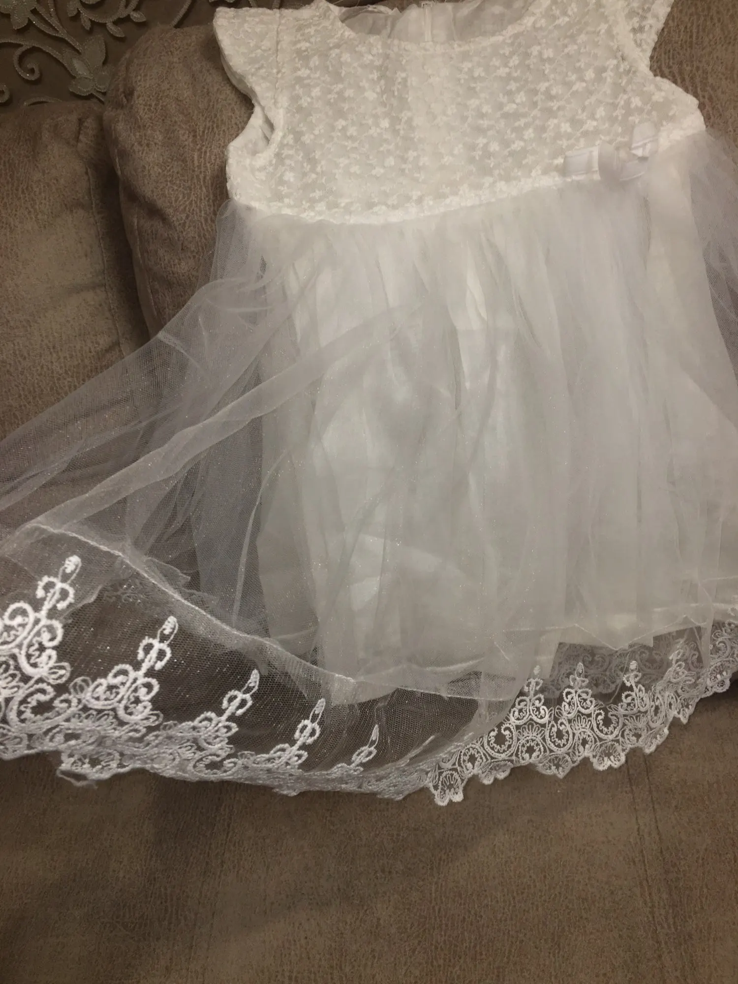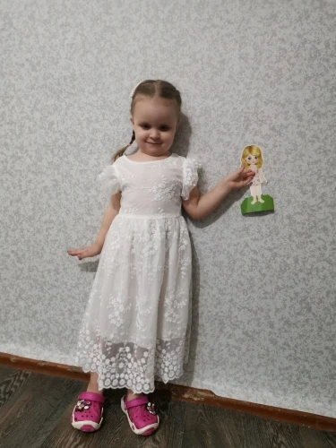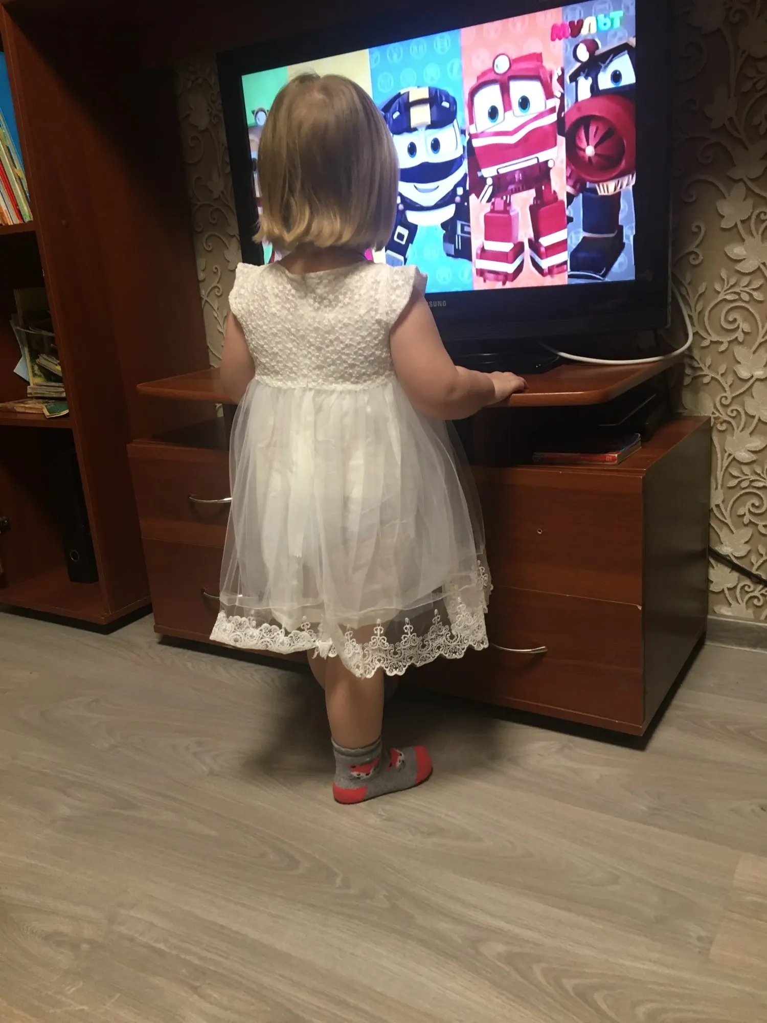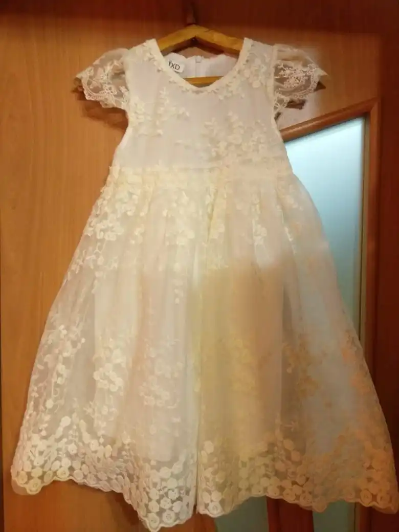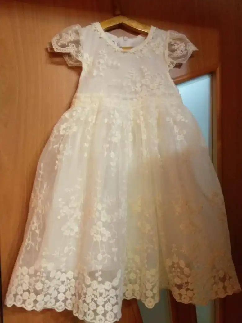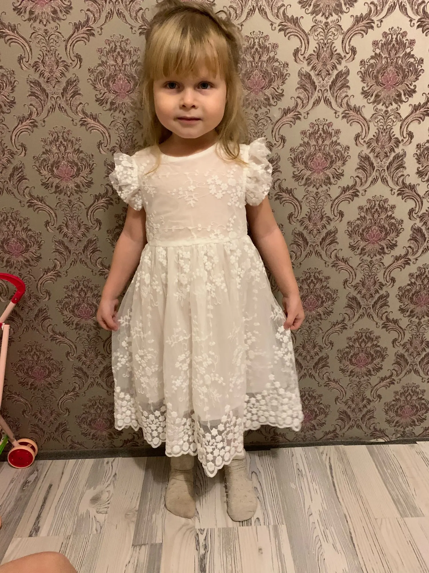 Платье 110 заказала дочке на 2 годика, рост 89 см, платье село как я хотела, немного глубокие проймы для рук, но я знала, возможно подошью. Пришло примерно за месяц. Не белое, молочное скорее. Брала для фотосессии на новый год