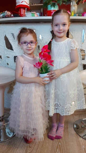 Платье очень красивое, нежное. Размер 7 хорошо сел на рост 122. С кринолином вообще супер. Рекомендую. Буду ещё заказывать у этого продавца.