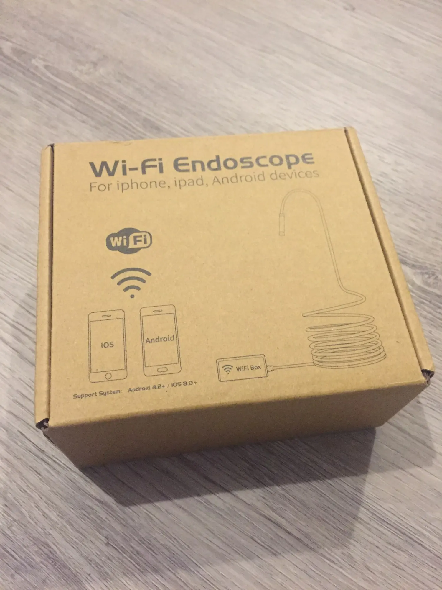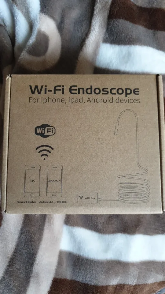 Работает с iOS. Прикольная штука :) В комплекте есть насадки на камеру - зеркальце и ещё какие-то, пока не разобрался. На самой камере есть довольно яркая подсветка. В коробочку модуля Wi-Fi встроен аккумулятор. На сколько его хватает - пока хз, но на инспекцию пары мест должно хватать. Удобно лазить в труднодоступные места. Провод камеры довольно жесткий. Пришло крайне быстро в мос.область. Продавцу - мое увожение