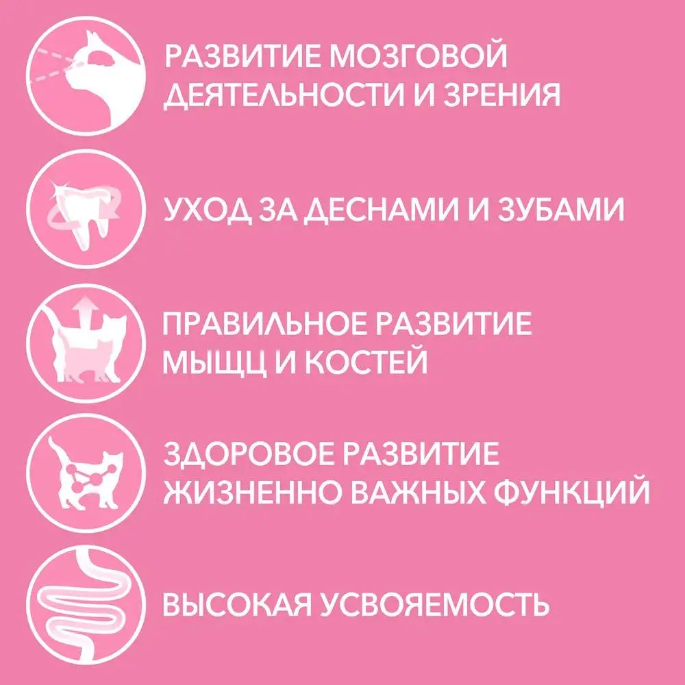 • Комплекс минералов способствует здоровому развитию мышц и суставов котенка.
