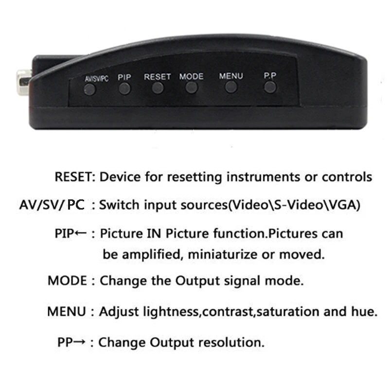 Обзор:RCA/ AV/VGA/ S-video to VGA video Converter имеет композитный RCA/ AV/VGA/ S-video вход, VGA выход. Идеально подходит для камеры видеонаблюдения, dvd-плеера, цифрового спутникового телевидения (DSTV) с композитным RCA/s-видео для отображения на мониторе VGA/TV для образования, бизнес-презентации, коммерческого продвижения, конференции, выставка, И т. Д. Простое переключение между разными входными источниками.Он может работать без ПК/ноутбука, Передача видеосигнала с композитного RCA/ AV / S-Video на VGA, его нельзя использовать с пониманием. Спецификация:1. Цвет: черный2. Тип продукта: VGA/S-video/Композитный RCA/ AV-VGA конвертер3. Входной порт: VGA, S-video(4 pin), Композитный RCA/ AV4. Выходной порт: VGA5. Источник питания: 5 В постоянного тока 1A6. Тип штепсельной вилки: штепсельная вилка стандарта США7. Передача видеосигнала от композитного RCA/ AV / S-Video к VGA, его нельзя использовать с пониманием. Особенности:1. Частота обновления может быть легко переключена на amaong 60HZ-75HZ и фотографии не мерцают2. Разрешение может быть легко переключено между (800X600/1024X768/1280X1024/1440X900/1600X1200/1600X900/1366X768/1680X1050/1920X1080/1920X1200),CRT монитор и ЖК-монитор все совместимы3. Уникальная функция сброса, чтобы предотвратить слишком высокое разрешение, тогда машина не может показать дисплей сброса4. Супер 3D Функция шумоподавления изображения, делает фотографии более четкими, стабильными5. Интерфейс AV/S-Video input может быть подключен к DVD/PDP/PS2/игровой консоли и т. д.6. Широкополосный переключатель PC/TV (200 МГц)7. Преобразование VGA/s-видео/Композитный RCA/ AV в VGA8. Включите DVD/DVR, CCTV (замкнутое телевидение), камеру и т. Д., чтобы отображаться на мониторе ПК или ЖК-дисплее9. Одна кнопка для легкого переключения между разными входными источниками10. Кнопка "вход", "меню"11. Регулируемый вход, яркость, контракт, насыщенность и оттенок12. Поддерживаемое разрешение выхода VGA: 800X600 60 Гц, 800X600 75 Гц, 1024X768 60 Гц, 1280X1024 Гц13.PAL/NTSC auto-detective14. Функция замораживания изображения15. Функция OSD (On-Screen-Display).16. Автоматическое Сохранение настроек и рабочее состояние при выключении питания. Применение:Подключите камеру видеонаблюдения, dvd-плеер, цифровое спутниковое телевидение (DSTV) с композитным RCA/s-видео для отображения на мониторе VGA/TV для образования, бизнес-презентации, коммерческого продвижения, конференции, выставки и т. Д.