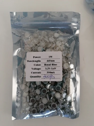 Заказывал Royal Blue 445nm. В этот раз дошло быстро, за 18 дней. Количество соответствует. Все светодиоды проверены. При токе 0,7А разброс падения напряжения в партии из 100 шт. составил 3,4-3,54 В (при обещанных на наклейке 3,2-3,6 В). Это хороший показатель для такой цены. Светодиоды магнитятся, но я знал, что беру (смотри цену).