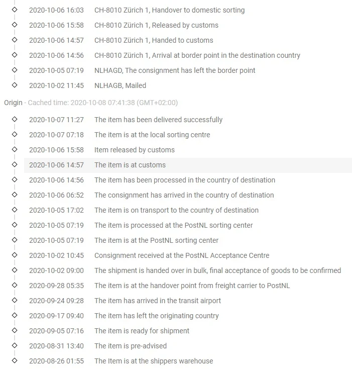 Заказ: 24 августа, доставка была обещана в течение максимум 35 дней с Нидерландов PostNL International. Отслеживание показало «товар готов к отправке» с 5 сентября до 17 сентября, то есть: в течение 12 дней он был готов к отправке! Товар прибыл в Швейцария 6 октября, и я получил его 7 октября. В общей сложности 44 дня для этой доставки... Дольше обещанного, и я считаю, что это слишком долго.