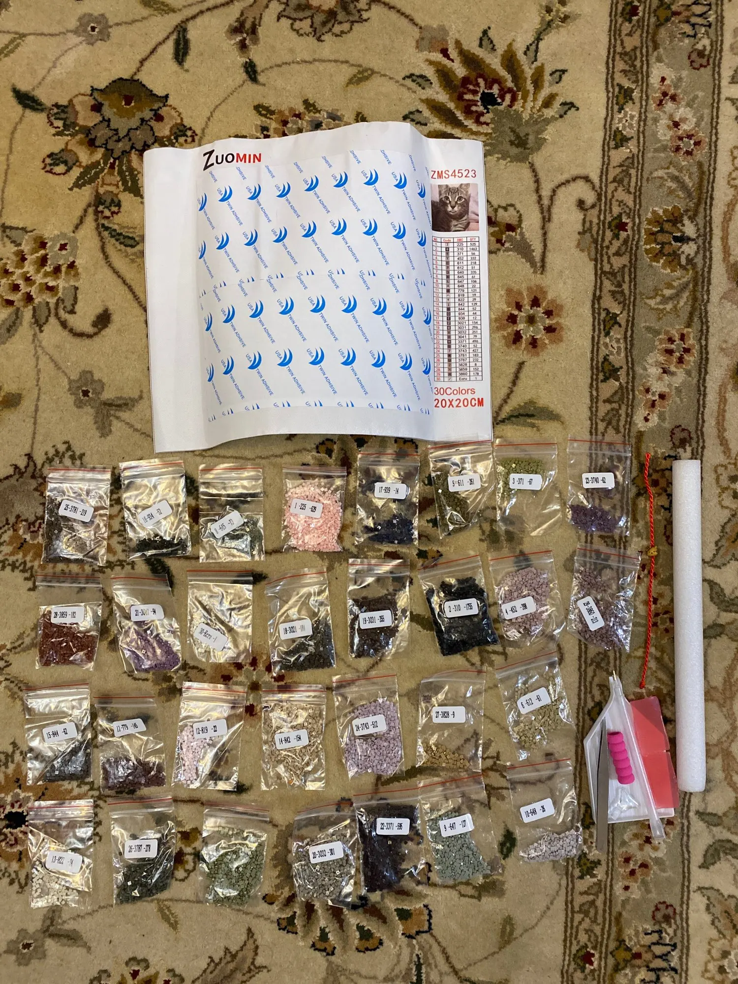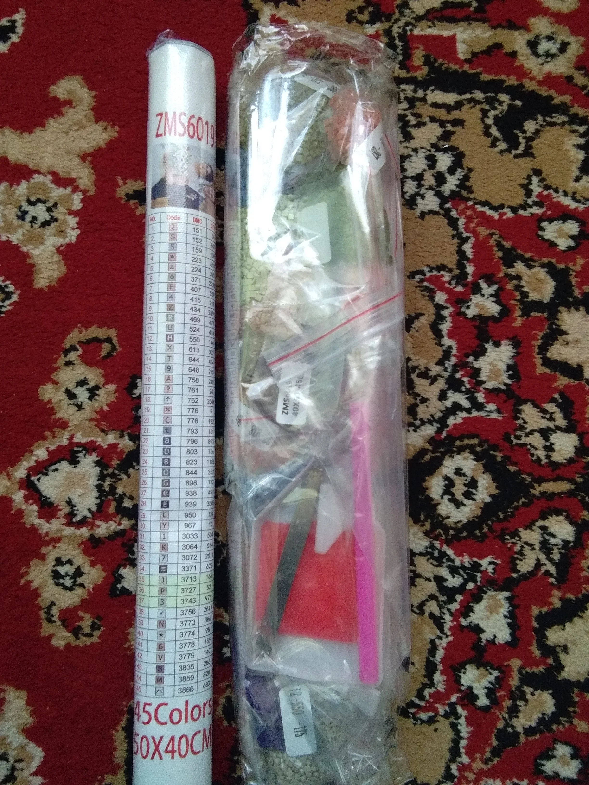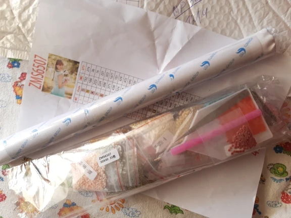 Заказ был сделан 22 февраля, получила 10 апреля. Заказ шёл больше месяца. Коробка немного помята, но внутри всё без повреждений, картина свёрнута в аккуратную трубочку. Количество пакетиков со стразами соответствует количеству цветов на маркировке, про качество пока ничего сказать не могу. После того, как соберу мозаику оставлю ещё один отзыв.