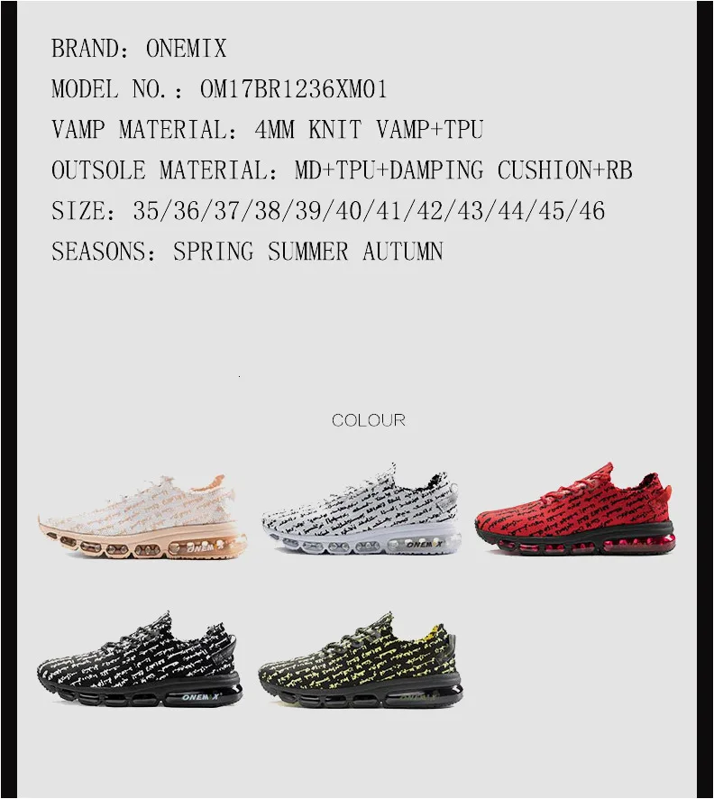Бренд: ONEMIX Номер модели: OM17BR1236XM01 Материал передней части: 4 мм трикотажная передняя часть + ТПУ Материал подошвы: MD + TPU + амортизирующая подушка + RB Размер: EUR 35-46,US 3,5-12 Сезоны: весна-лето-осень