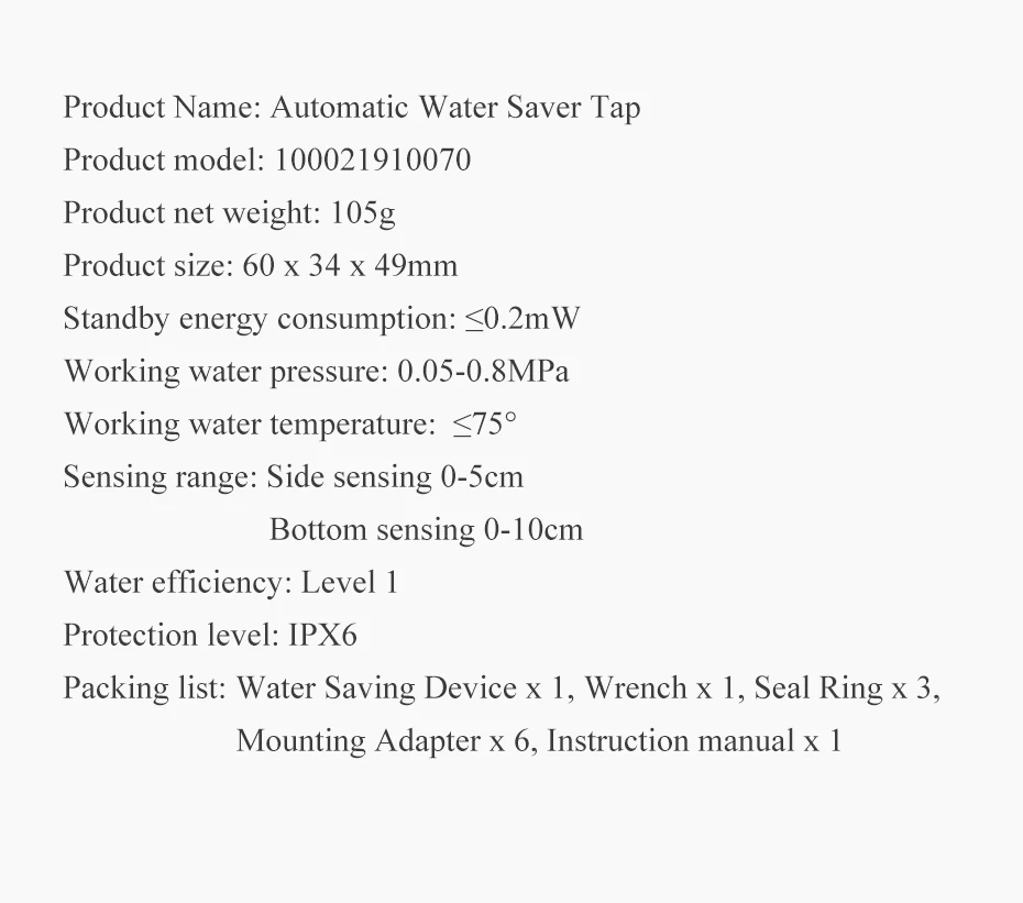 Вес изделия: 105 гРазмер изделия; 60 × 34 × 49 ммВ режиме ожидания потребление энергии: 0,2 МВтРабочее давление воды: 0,05-0.8MPaРабочая температура воды; ≤ 75 °CДиапазон измерения: боковое измерение 0-5 см/донное измерение 0-10 смУпаковочный лист: Индукционное устройство для экономии воды * 1, монтажный ключ * 1, уплотнительное кольцо * 3, адаптер * 6, руководство