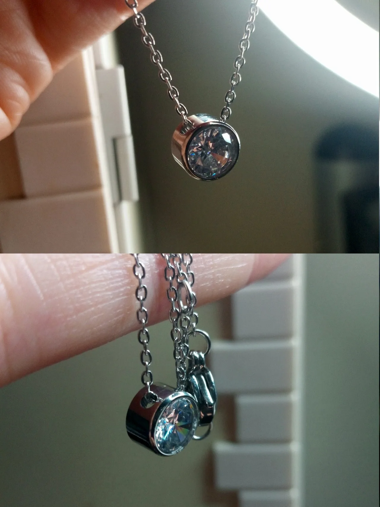 К сожалению, один из ожерелья был неисправен, кристалл был плохо установлен, и он почти выпадает. Продавец должен обратить особое внимание и провести быструю проверку качества перед отправкой. Но другой красивый, хорошо отполированный, и подвеска имеет хороший вес. Сверкающие кристаллы, больше, чем я ожидал. Очень тонкая изящная цепочка красивого серебристого цвета. Ожерелье сидит близко к моей маленькой шее, но есть сдержанная Регулируемая цепочка, чтобы сделать его дольше. Я купил это ожерелье в продаже всего за 1,54 евро за каждую, включая бесплатную доставку. Хорошо упаковано. Отслеживается или частично отслеживается отправка. Рекомендуется!