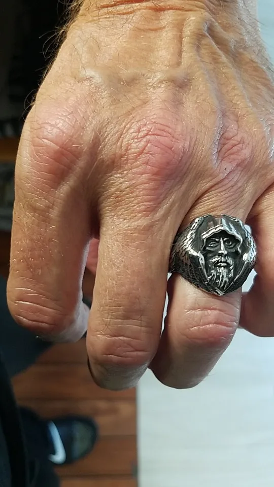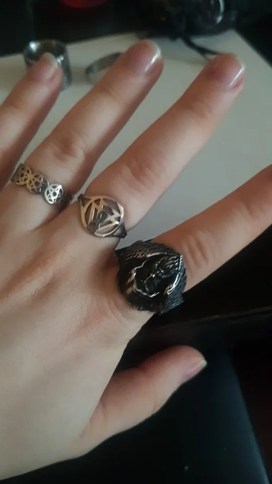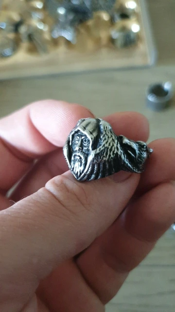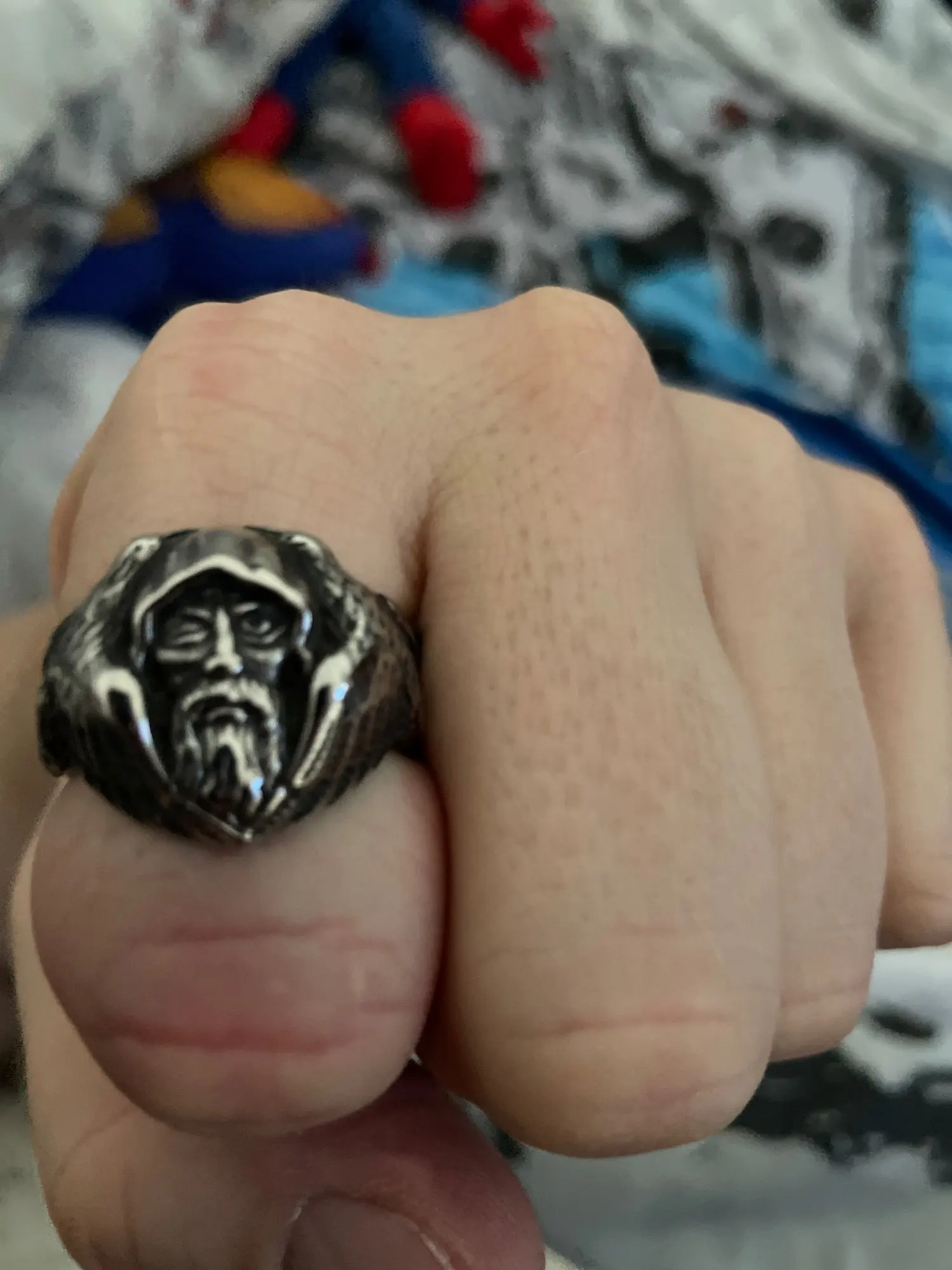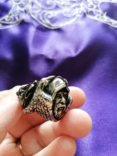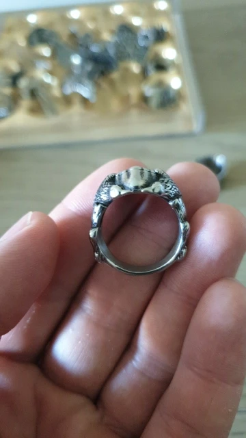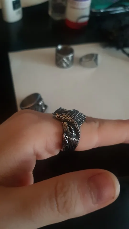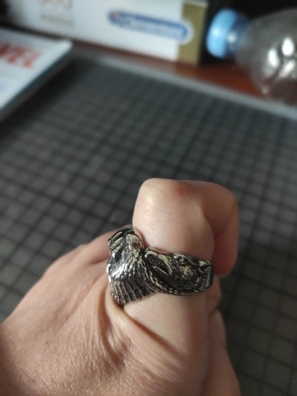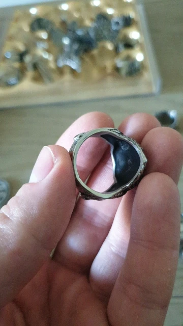 Это позор, потому что он намного темнее, чем на картинке. У него хороший уровень детализации, он довольно большой, а внутри он не совсем полый. Он достаточно весит для такого подробного кольца. Это хорошее кольцо, но оно не делает его таким темным. Я довольно доволен. Но я буду покупать в этом магазине без колебаний.