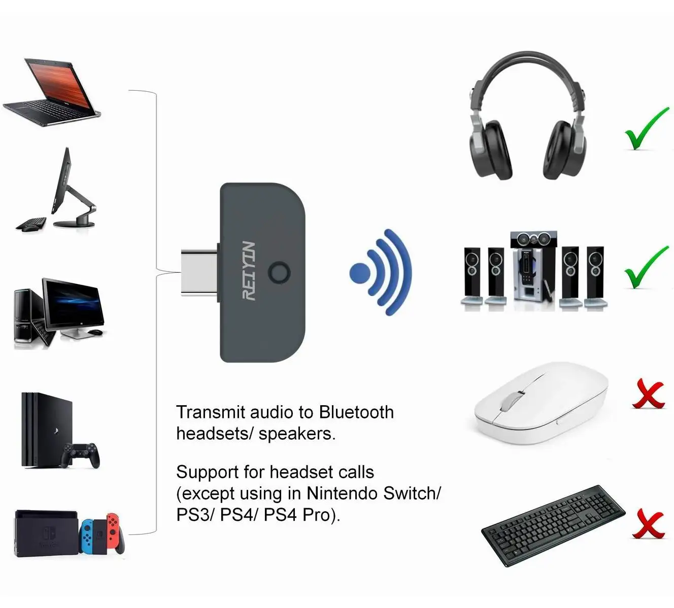 Поддержка Микрофона, этот передатчик поддерживает беспроводную связь с микрофоном Bluetooth гарнитуры, передает звук, который Bluetooth гарнитуры микрофон вход по Bluetooth, легко общаться с другими людьми. Примечание: микрофон не поддерживается при использовании в Nintendo Switch / PS3 / PS4 / PS4 Pro.
