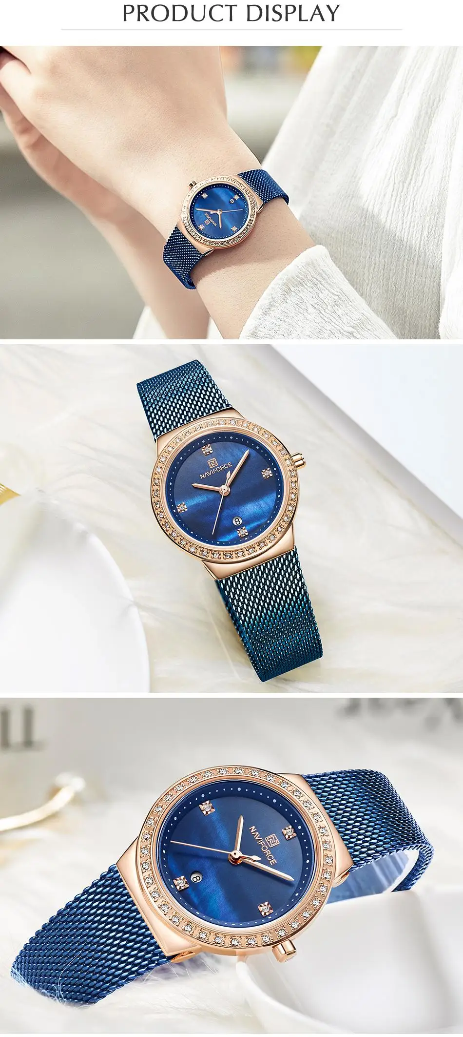 Модные брендовые женские кварцевые часы NAVIFORCE с сетчатыми ремнями из нержавеющей стали, Женский креативный роскошный циферблат