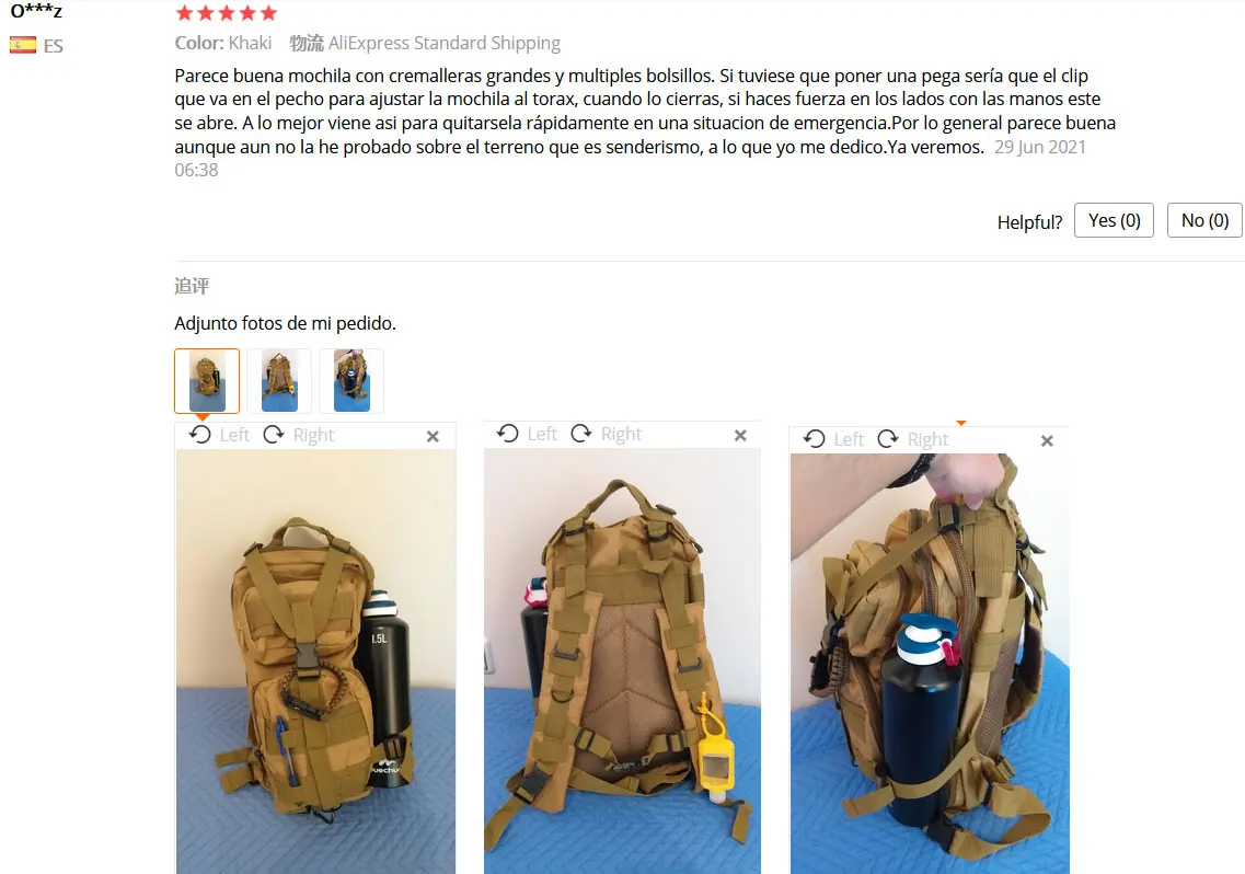 Parece buena mochila con cremalleras grandes y multiples bolsillos. Si tuviese que poner una pega sería que el clip que va en el pecho para ajustar la mochila al torax, cuando lo cierras, si haces fuerza en los lados con las manos este se abre. A lo mejor viene asi para quitarsela rápidamente en una situacion de emergencia.Por lo general parece buena aunque aun no la he probado sobre el terreno que es senderismo, a lo que yo me dedico.Ya veremos.