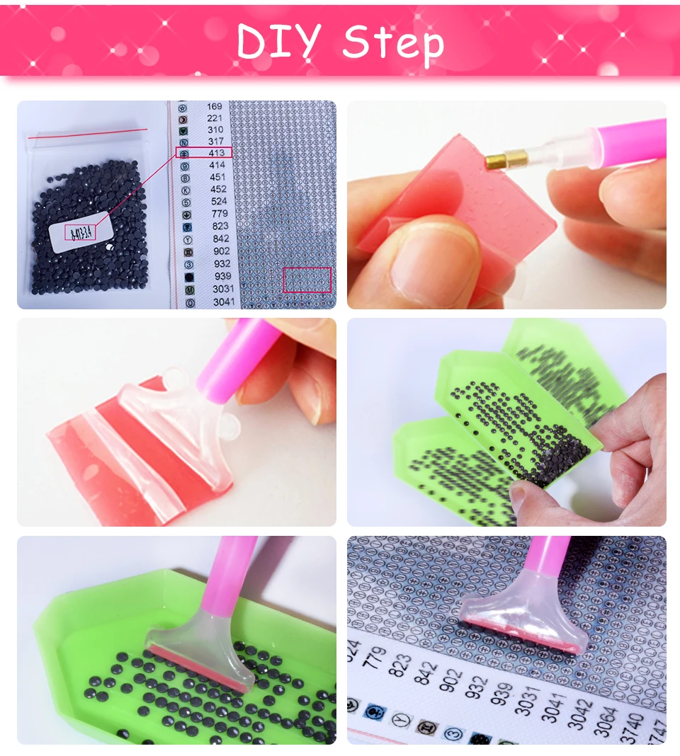 1. См. Таблицу сравнения на холсте, чтобы определить каждый номер алмаза и соответствующий номер печати на холсте. 2. Вставьте круглый конец ручки в Дозирующий цемент (нажмите, чтобы сохранить цемент на месте). 3. Используйте круглый конец ручки, чтобы приклеить бриллиант и слегка нажмите, чтобы удалить любой дополнительный цемент. 4. Разорвите частичную пленку и поместите алмаз на холст в соответствии с соответствующим номером. 6. После завершения слегка прижмите алмазы рукой или книгой, чтобы убедиться, что алмазы надежно закреплены.