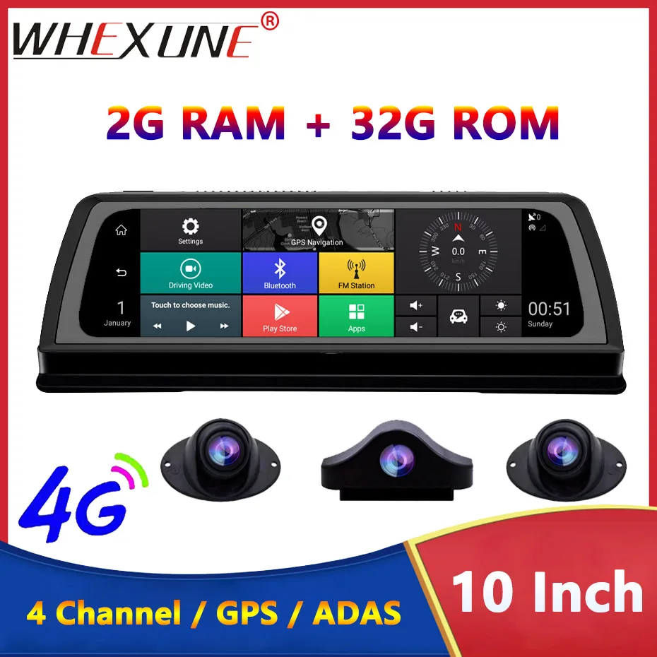 Автомобильный видеорегистратор Videcam, Автомобильная камера заднего вида с 4G, Android, 4 объективами, 10 дюймов, GPS-навигацией, ADAS, Wi-Fi, 2 Гб + 32 ГБ