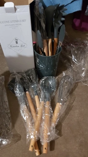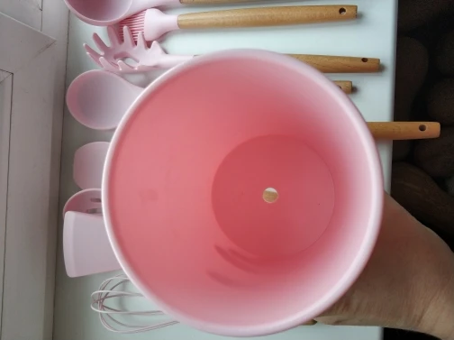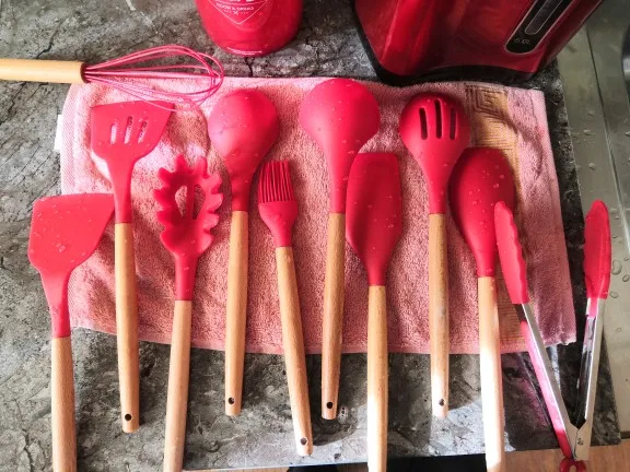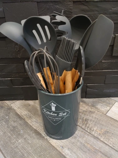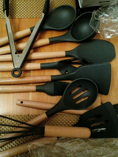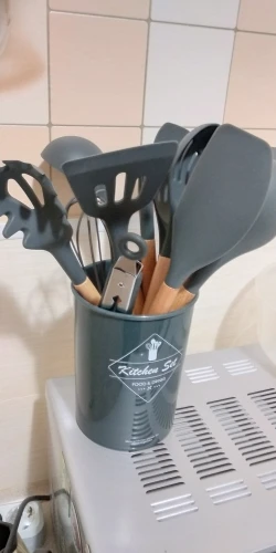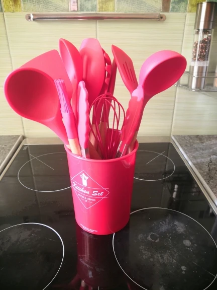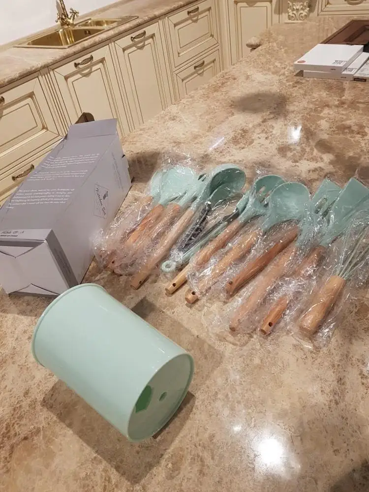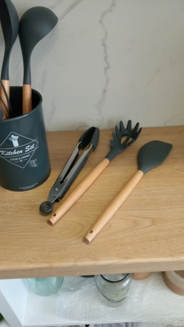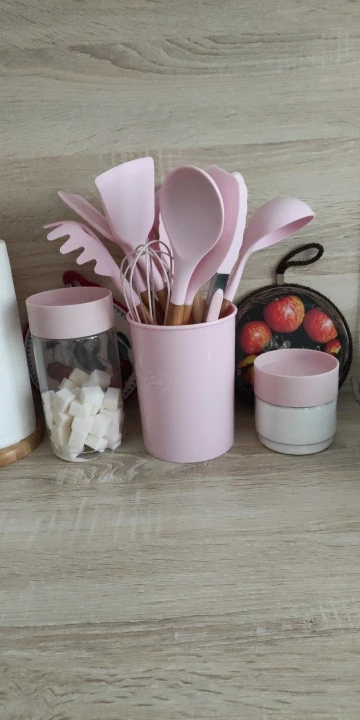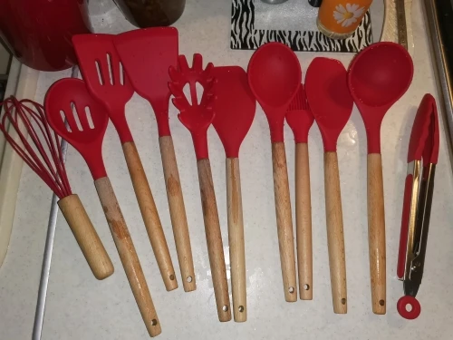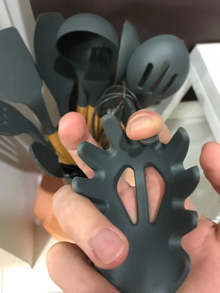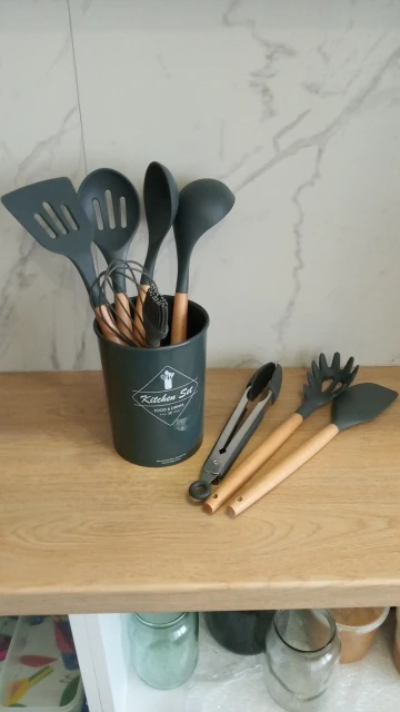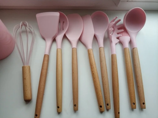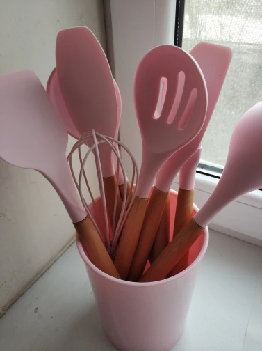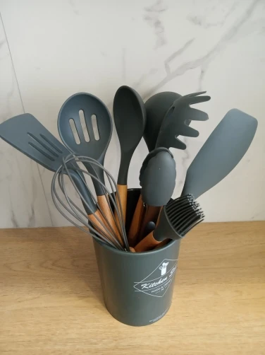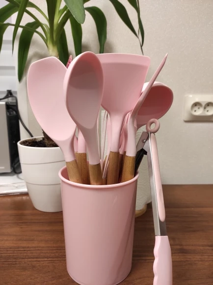 Силиконовая часть довольно сильно пахла, но, как и у всех, через сутки выветрилось. Присутствует небольшой облой. Деревянные ручки грубовато обработаны, есть шероховатости и облезлые торцы. На мой взгляд маловаты приборы для жидкостей и нет шумовки под пельмени. После покупки обнаружил, что в продаже есть полностью разноцветный набор . Данные наборы продаются под разными названиями везде, в том числе и WB.