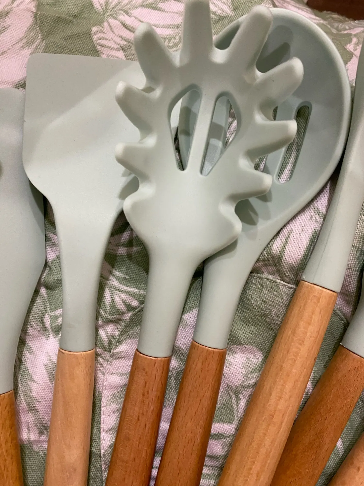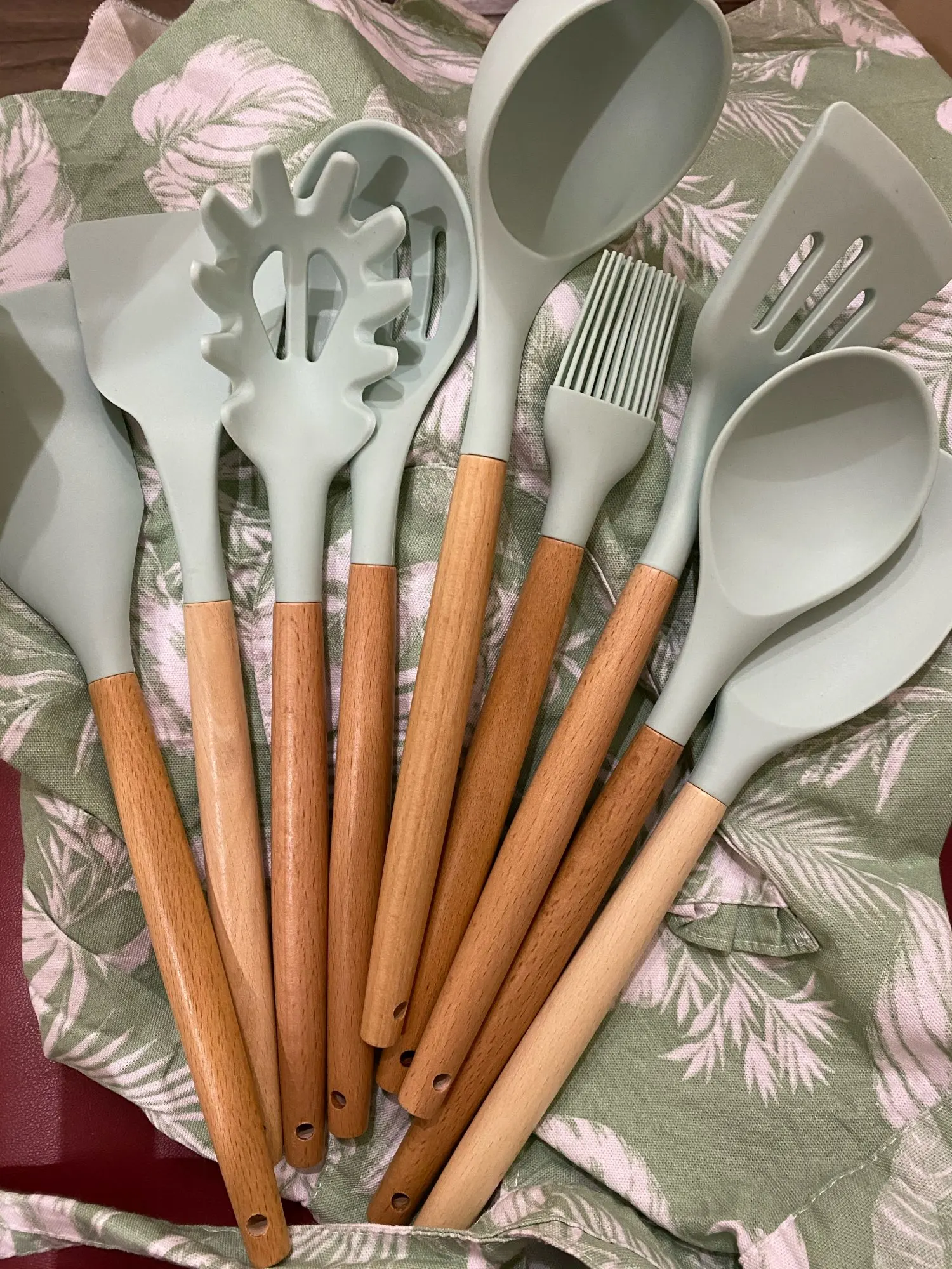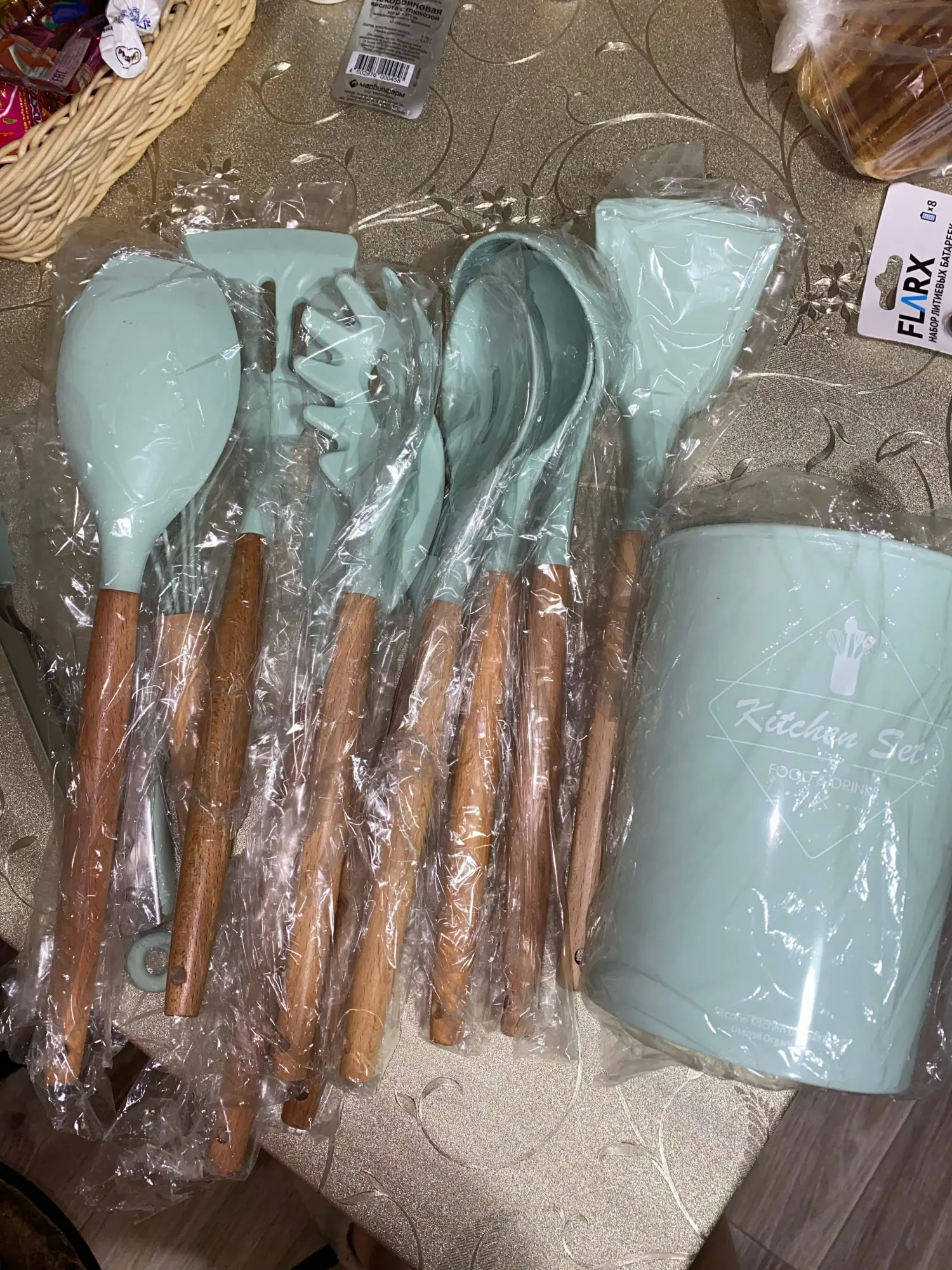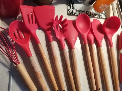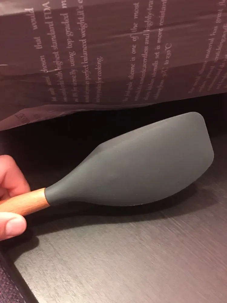 Силиконовая часть довольно сильно пахла, но, как и у всех, через сутки выветрилось. Присутствует небольшой облой. Деревянные ручки грубовато обработаны, есть шероховатости и облезлые торцы. На мой взгляд маловаты приборы для жидкостей и нет шумовки под пельмени. После покупки обнаружил, что в продаже есть полностью разноцветный набор . Данные наборы продаются под разными названиями везде, в том числе и WB.