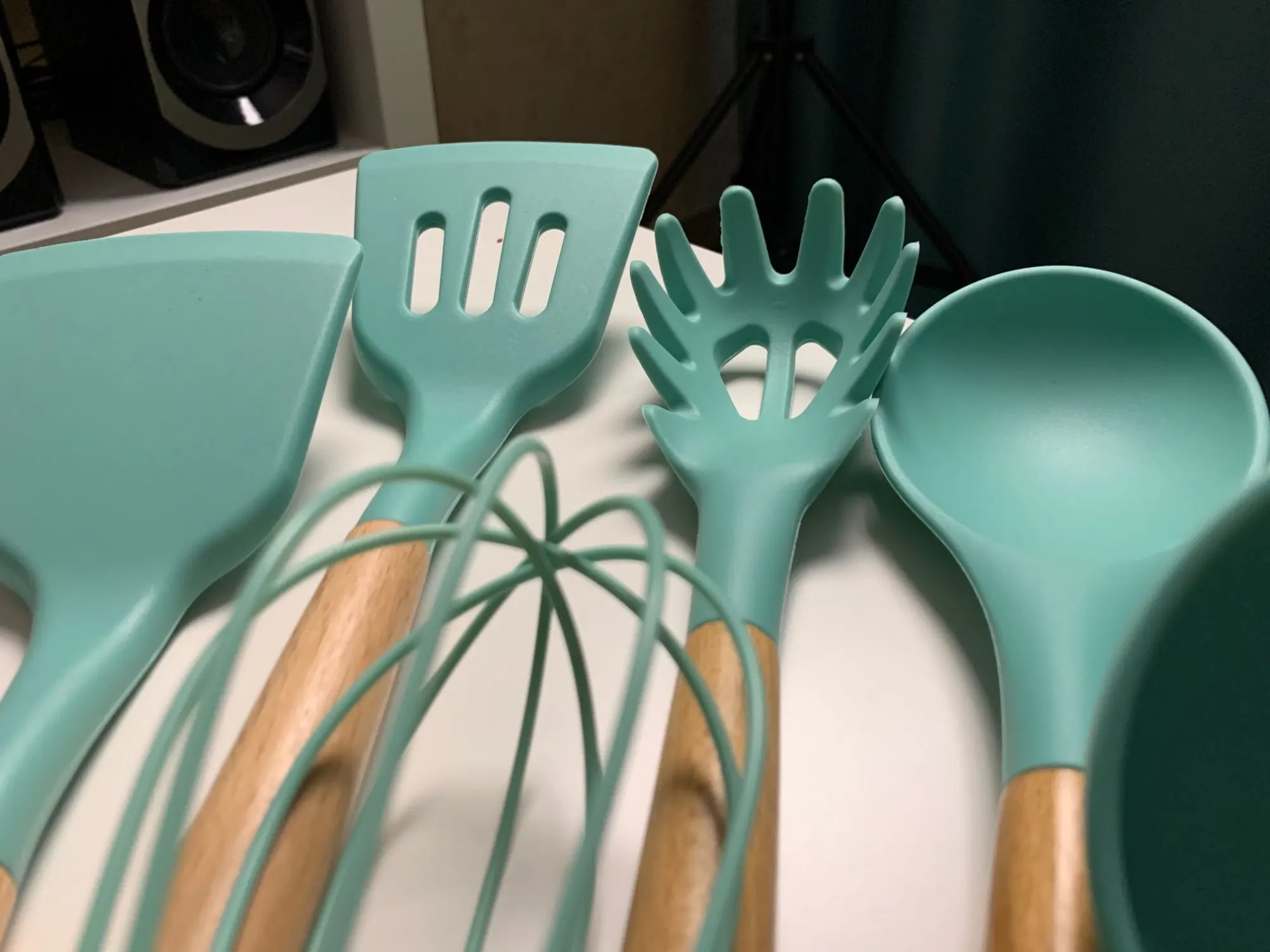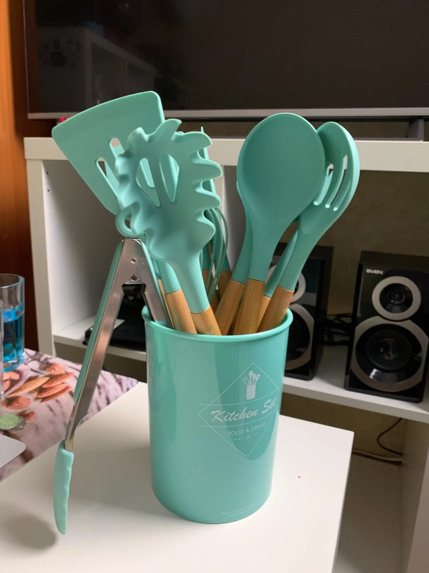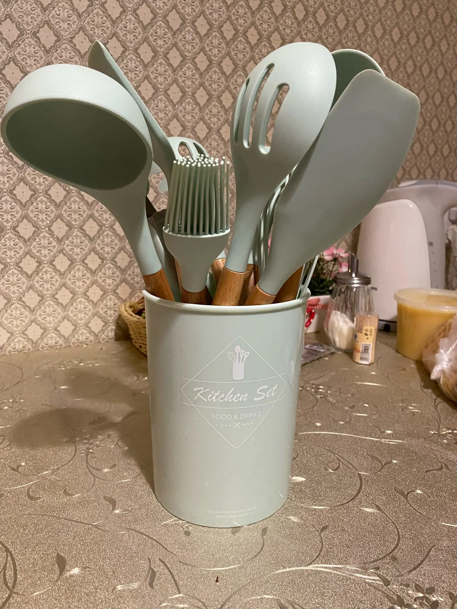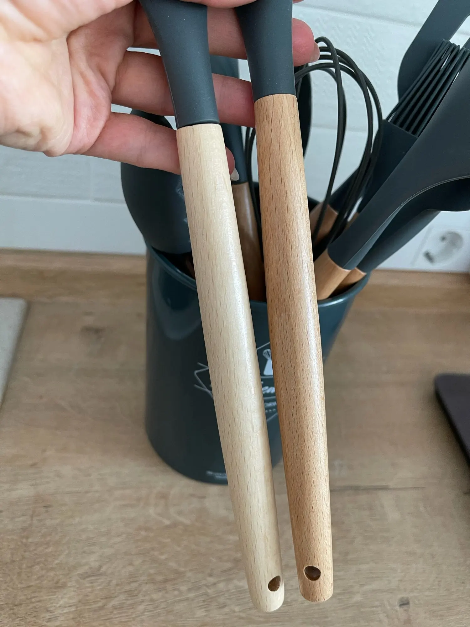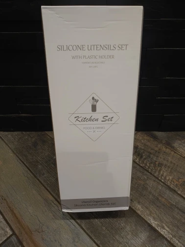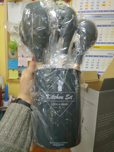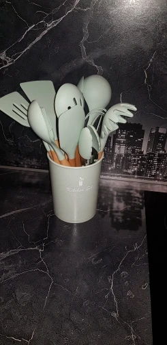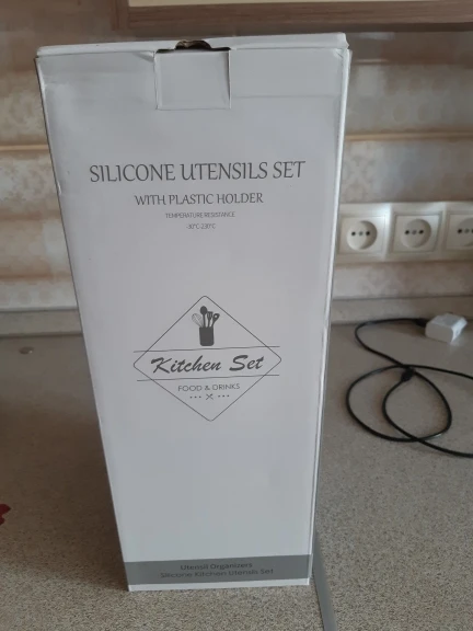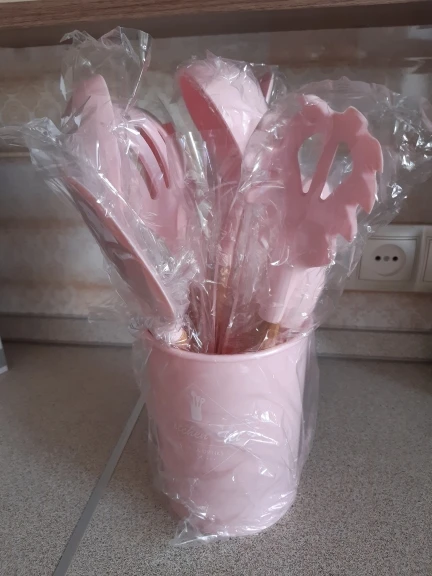 Отличный набор, заказали сразу два. Цвет очень приятный. Подставка пластиковая, сами приборы из очень плотного и упругого силикона, практически не гнутся( на фото показала изгиб при сильном нажатии), что очень удобно в готовке. Мягче пластика, но жёстче стандартной силиконовый посуды. Единственный минус деревянные ручки, поэтому только ручная мойка, но выглядят очень эстетично и удобны в использовании. Пользуемся каждый день, никаких нареканий. Заказ дошёл очень быстро, меньше недели.