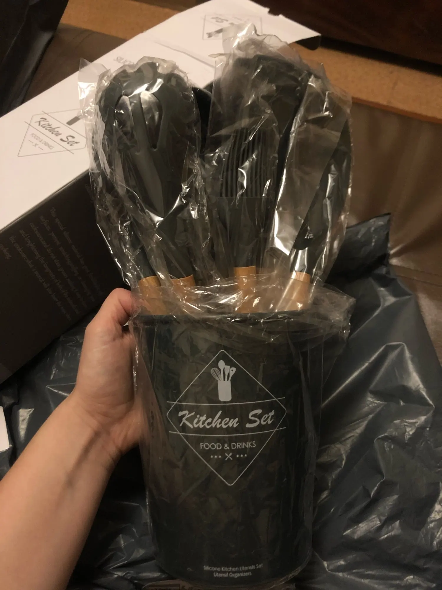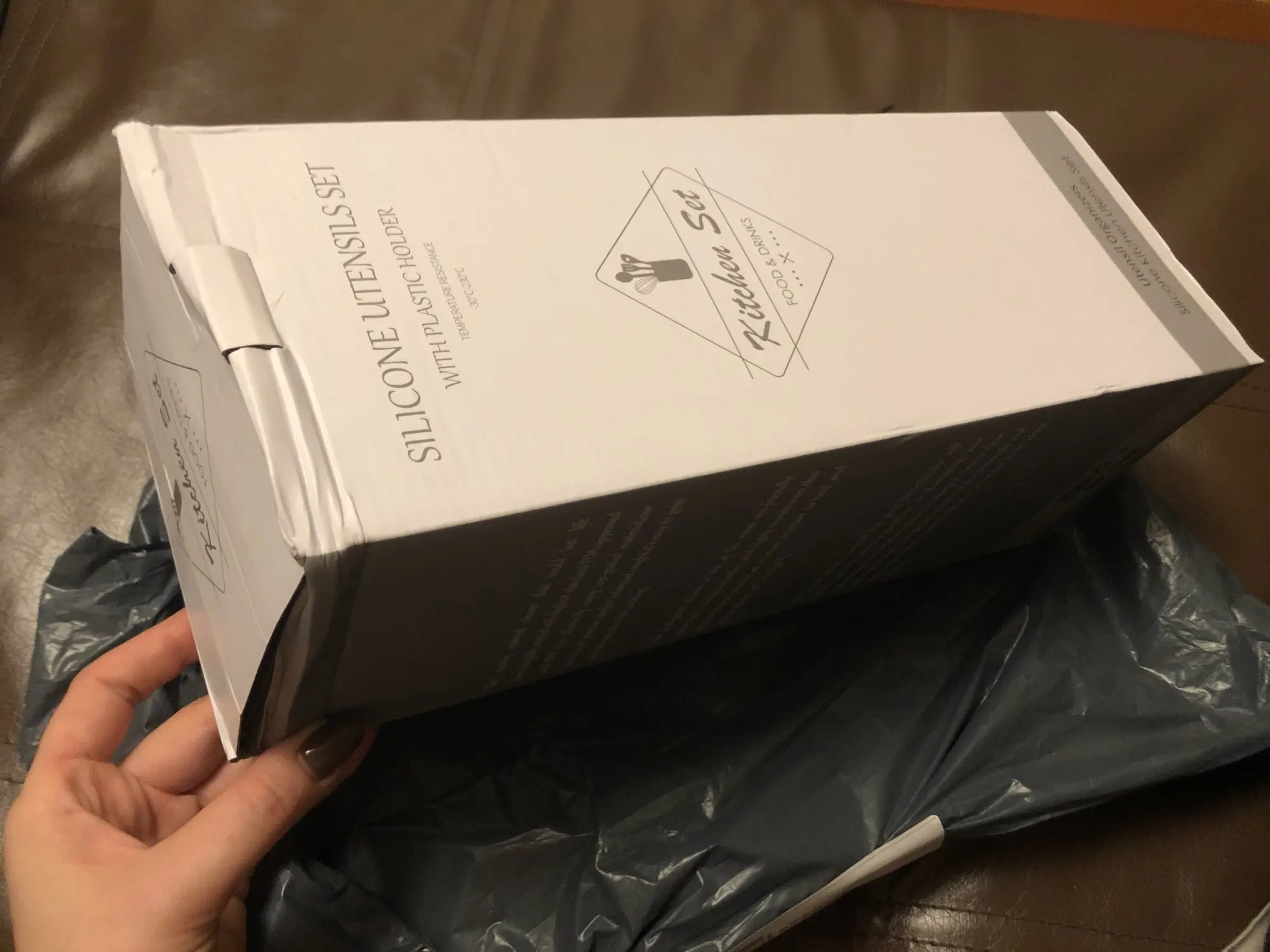Пришёл в Москву за 2(!!!) дня, курьер принёс домой. Качество отличное, можно мыть в посудомойке, к раскалённым сковородкам приборы не прилипают, не плавятся. Заказывала цвет темно-серый, но мне кажется, что есть небольшой зелёный отлив, не критично.