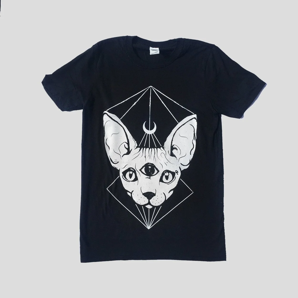 Футболка sunfize HJN в стиле панк, готика, Сфинкс, голова кошки, луна, принт, черная футболка с символом ведьмы, футболки для девочек в готическом стиле, Женская хлопковая футболка
