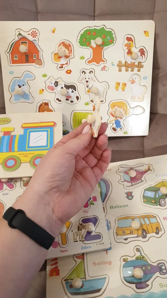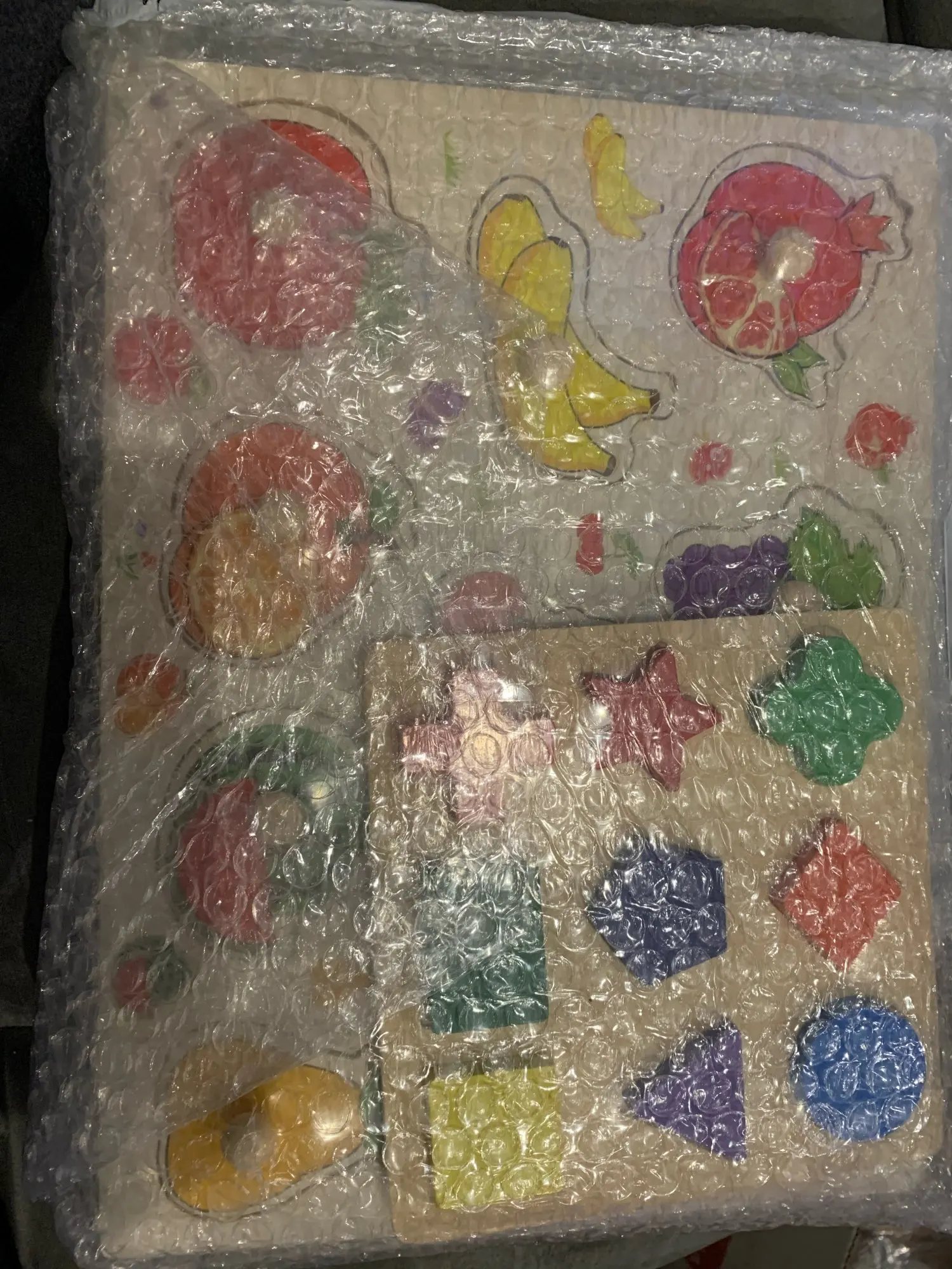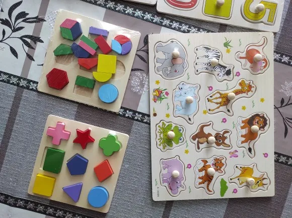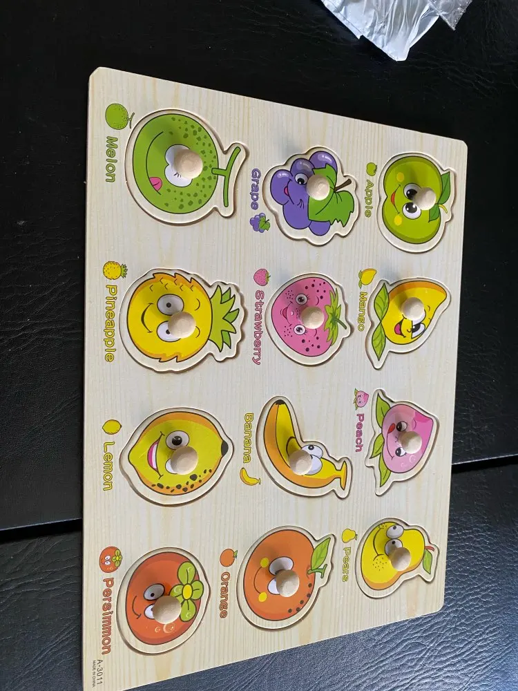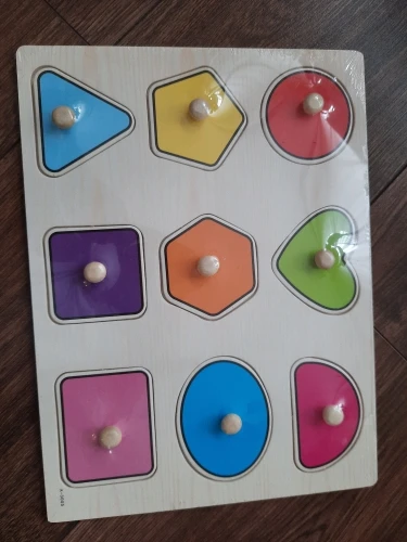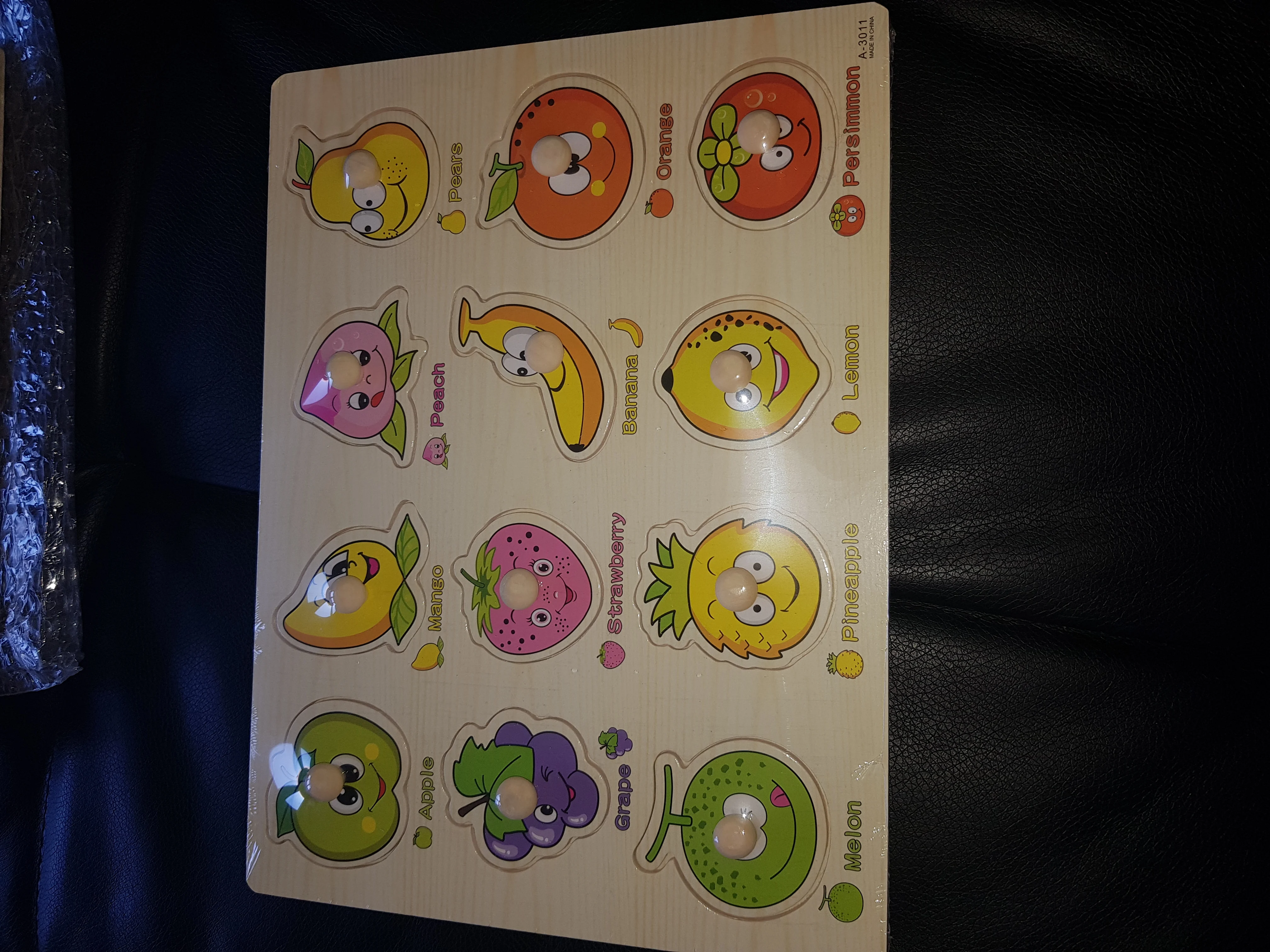 Заказывала 2 набора:один с фруктами, другой попроще для понимания-формы. Со вторым будет классно учить цвета. Ребёнку 10 месяцев, с удовольствием рассматривает, вынимает фигурки и пытается вставить обратно. Если вынуть фигурку, то на её месте есть цветная картинка. В общем, классная игрушка. Пришло меньше чем за месяц