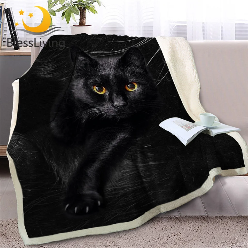 Черное плюшевое одеяло с 3D рисунком кошки на диван, одеяло из шерпы с животными, тонкое покрывало для питомцев 150x200 см