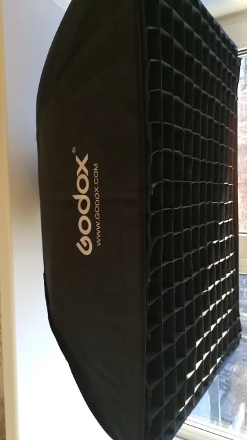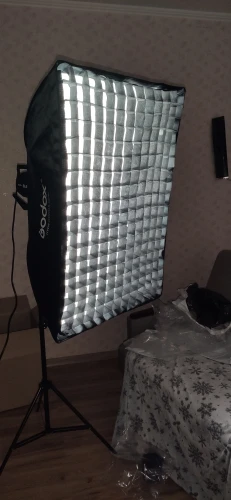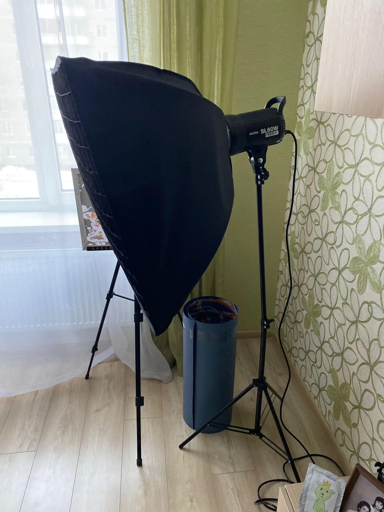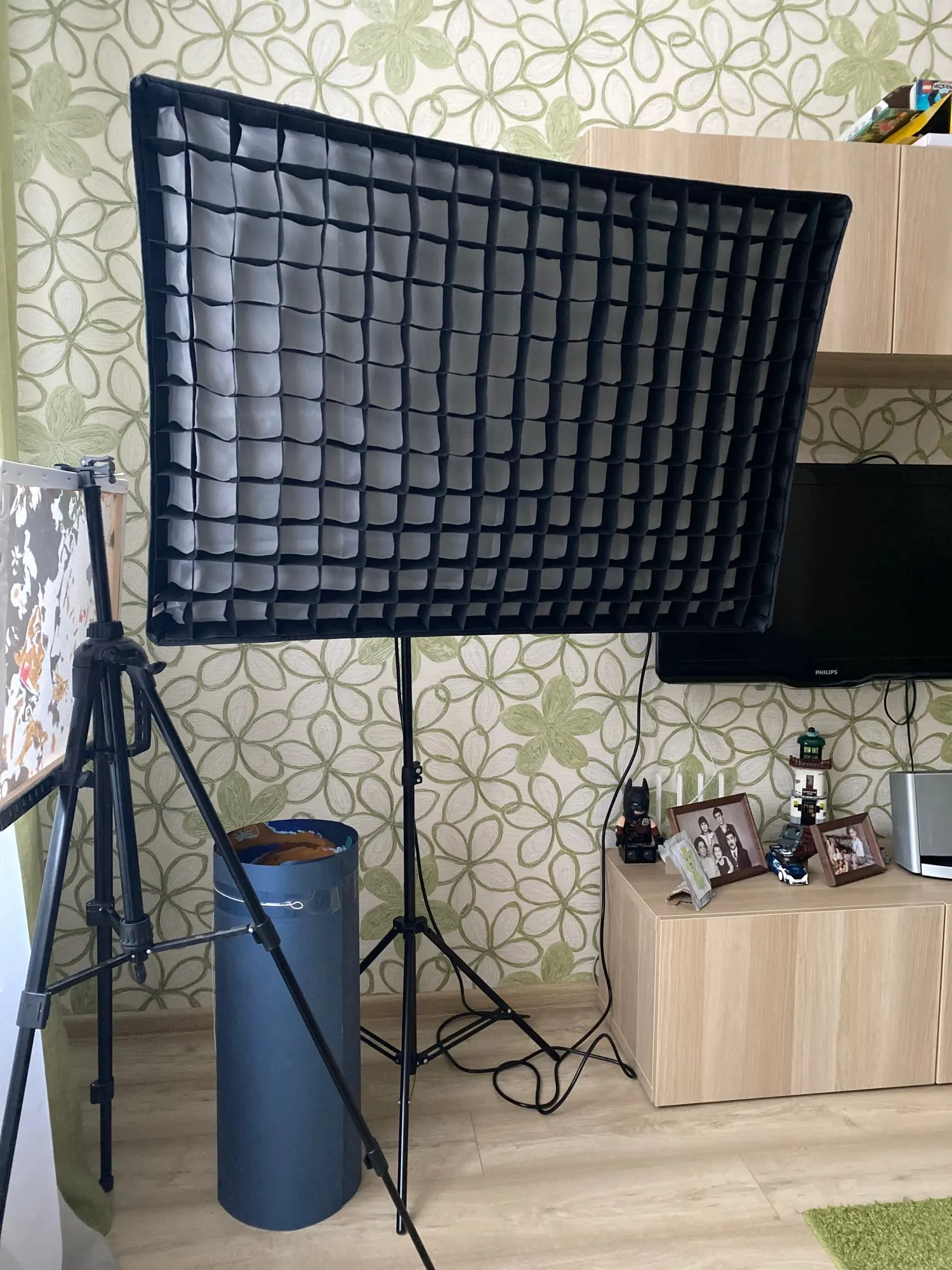 Оказалось, что эта штуковина очень большая! Всё работает хорошо. Правда, штатив хлипкий. Но если с ним бережно обращаться, то пойдёт. По крайней мере, всю эту конструкцию из прожектора и софтбокса 60х90 с двумя рассеивателями и направляющей сеткой держит, не ломается. Конечно, занимает много места. Но тут уж ничего не поделаешь. Разве что плоскую светодиодную панель использовать. Надо учесть, что глубина этой конструкции (от задней точки прожектора до плоскости рассеивателя софтбокса аж 70 сантиметров. Да, кстати, кабель питания почти 5 метровый.