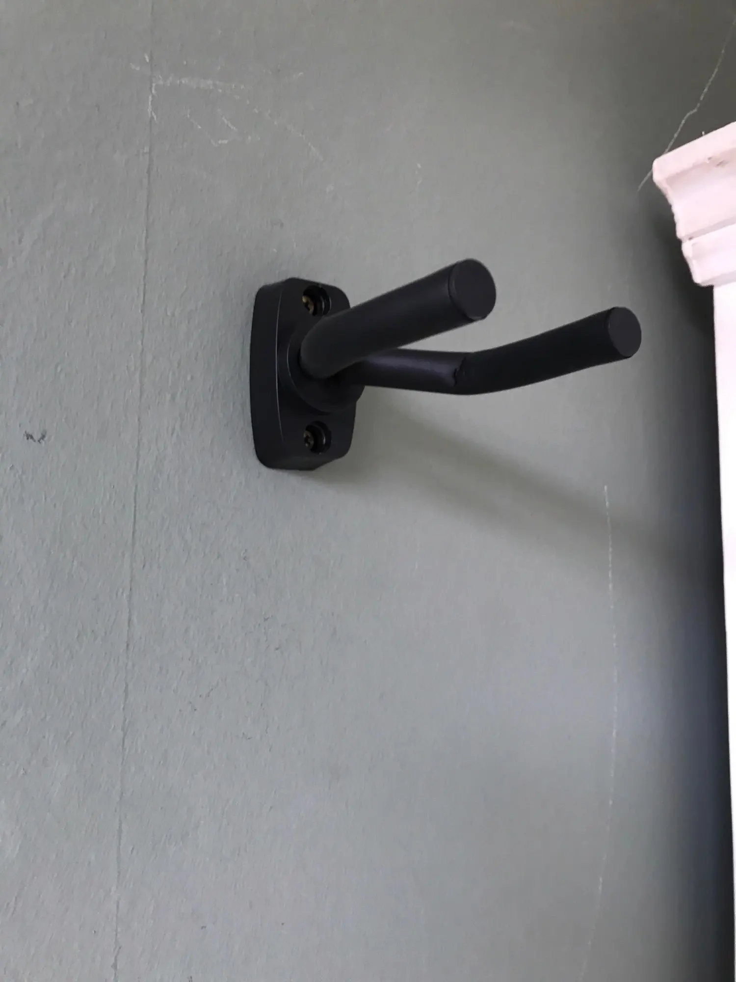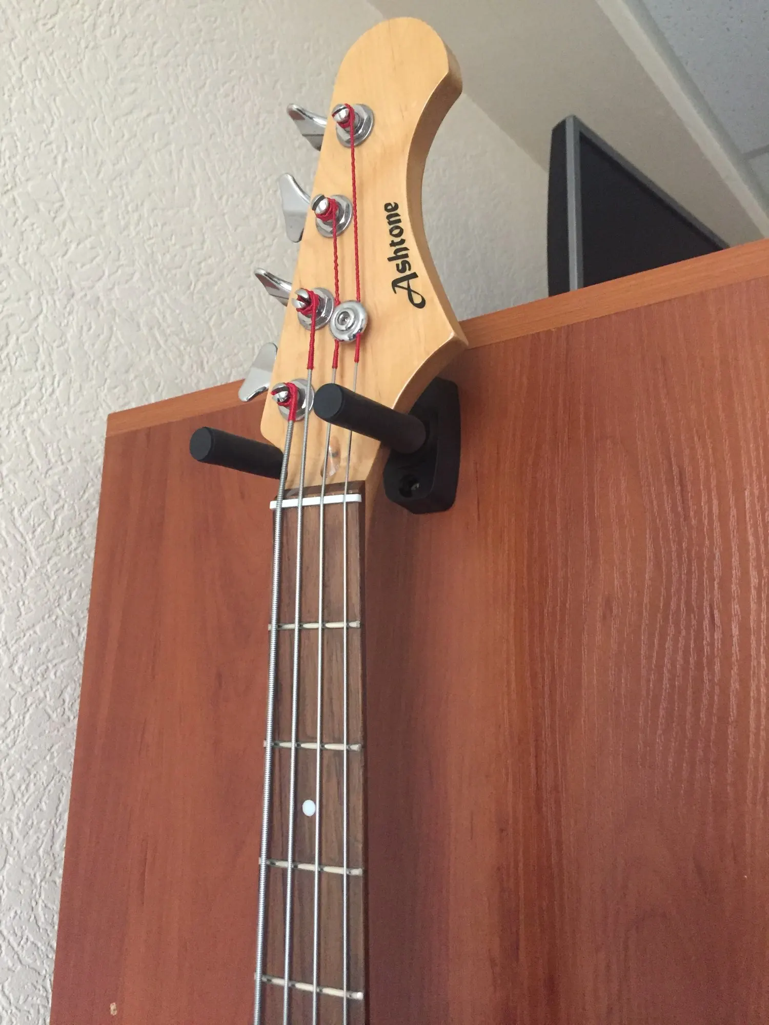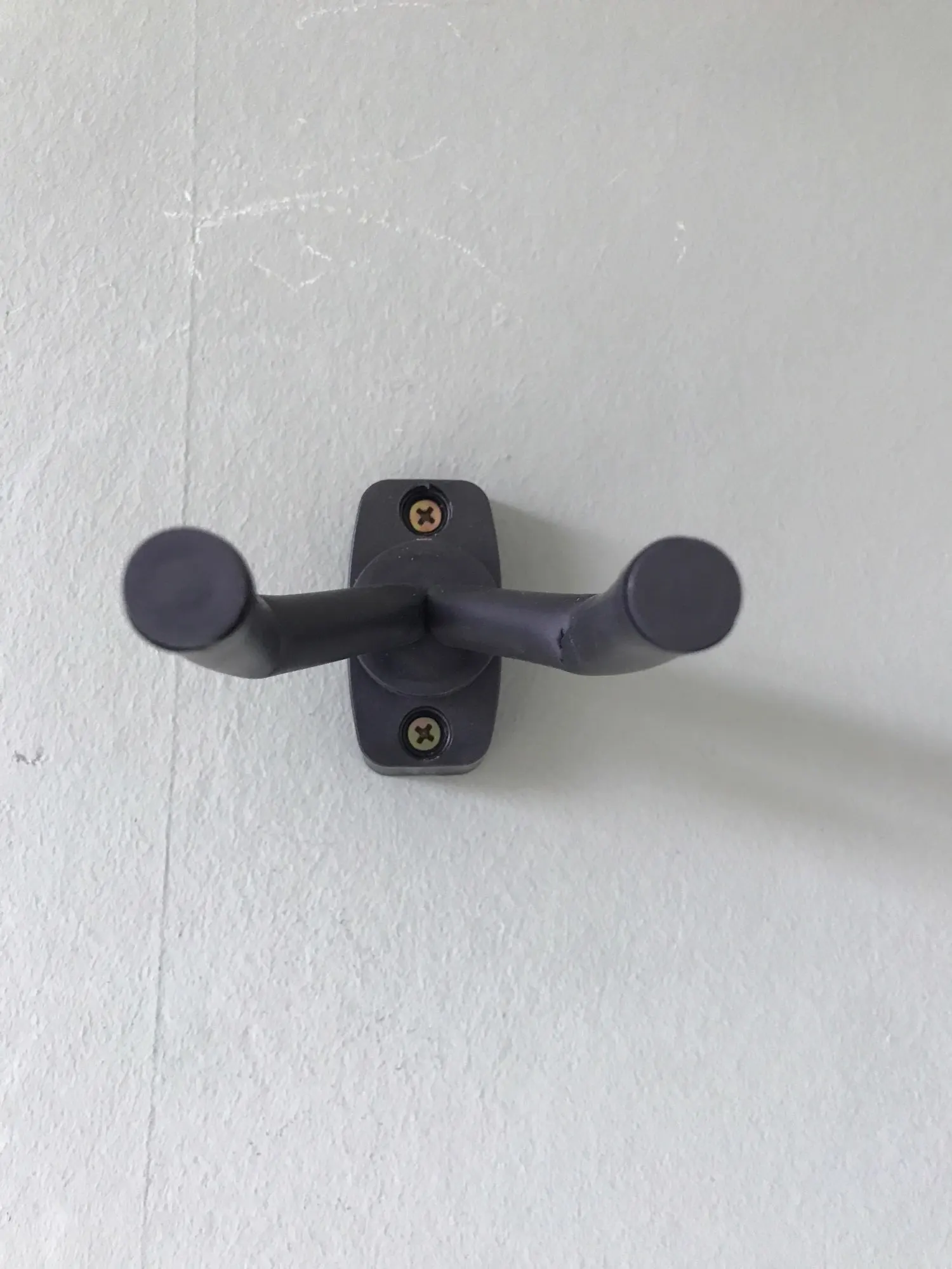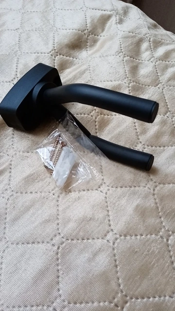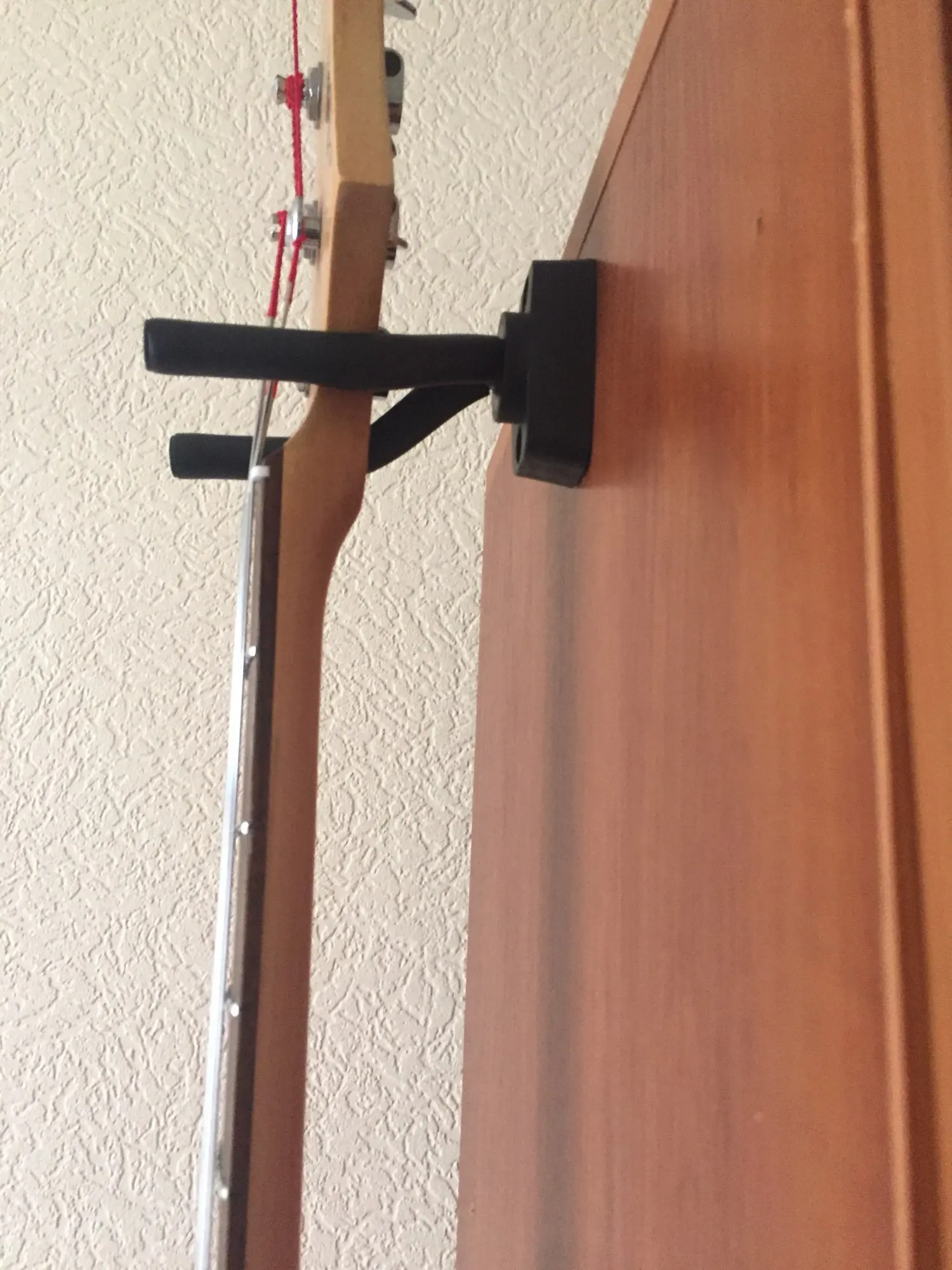 Всё в порядке. Поступил в согнутом для транспортировки виде, чтобы вместился гриф гитары надо разогнуть, при этом важно аккуратно, не переусердствовать чтоб не сломать. А так- висит, пользуешься, всё надёжно, резина не даёт гитаре выскользнуть.
