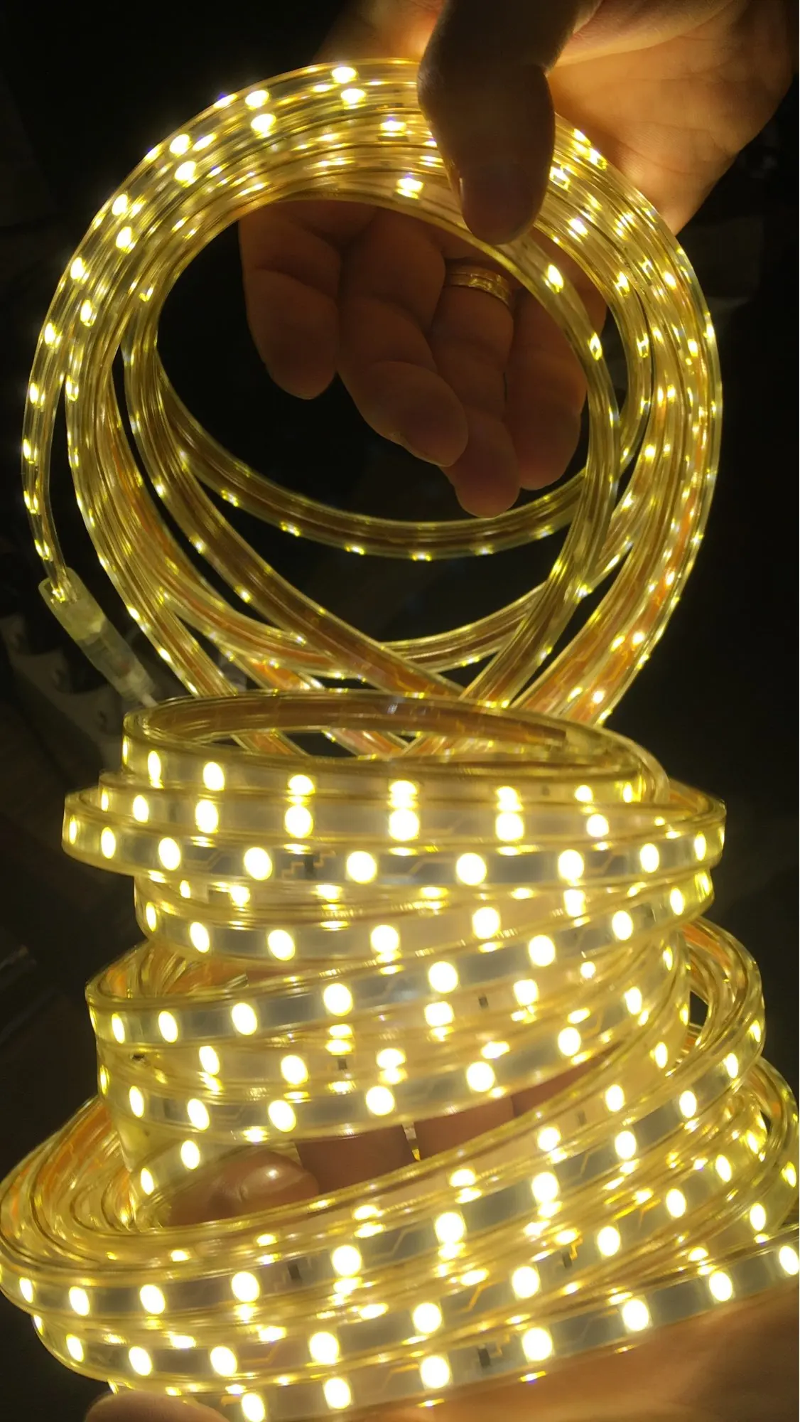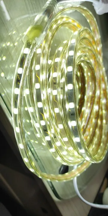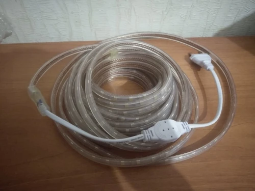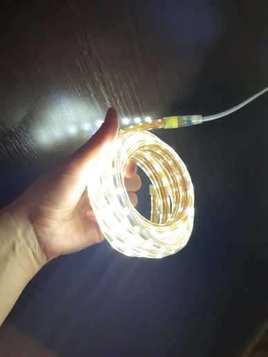 очень здорово упаковано, вроде неплохая защита от влаги, лента внутри цельной силиконовой трубки. но несколько нюансов - светодиоды мерцают, не очень яркие, и сделаны последовательно по метру, т.е. разрезать можно только кратно метру, к тому же если один из светодиодов выйдет из строя, не будет работать весь метр. скорее всего, запитаны от 220в постоянного тока, что тоже не очень хорошо в случае разгерметизации ленты. работает, это уже хорошо, но советую крепко подумать перед покупкой