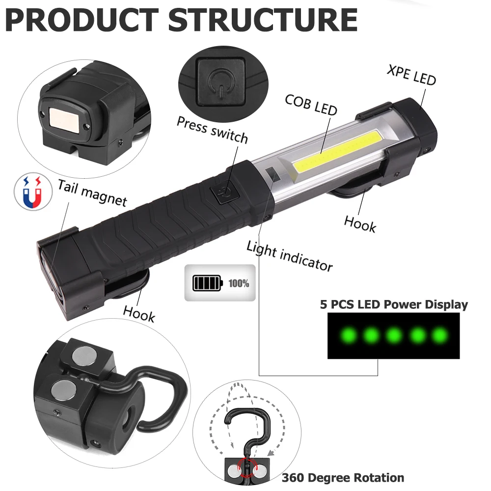Магнитная вспышка COB + светодиодный рабочий светильник USB-фонарик перезаряжаемый фонарик лампа для ремонта с крючком светильник вспышка