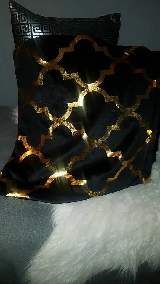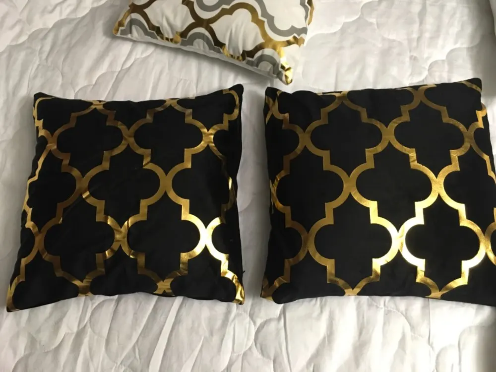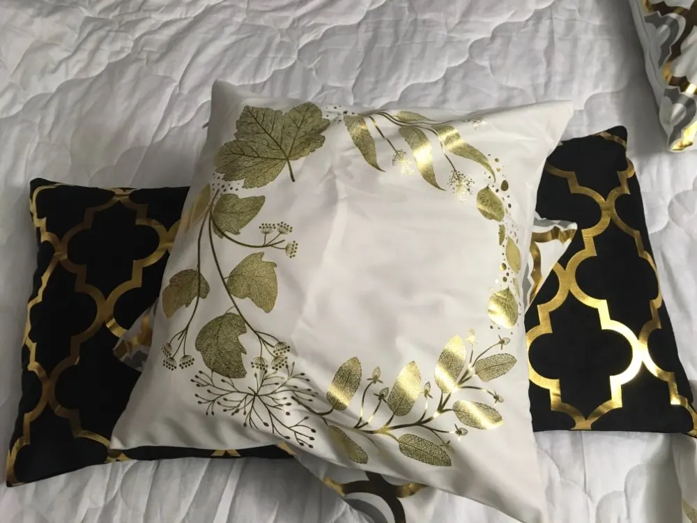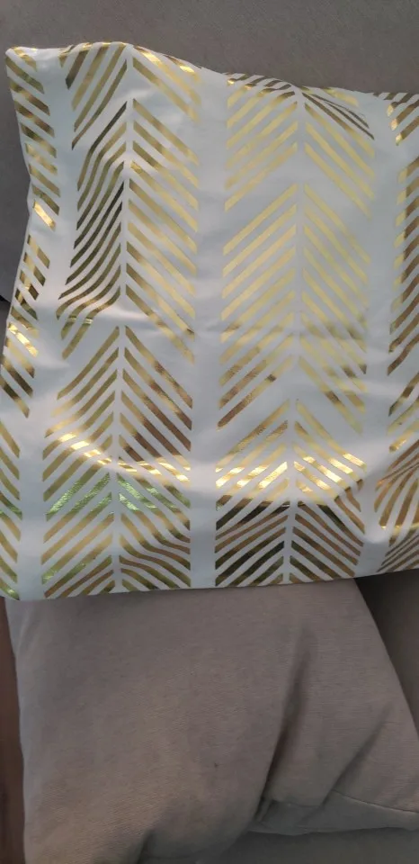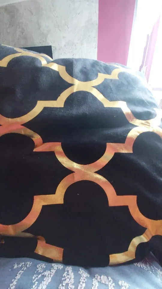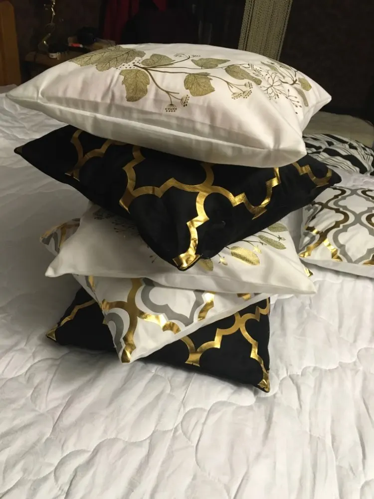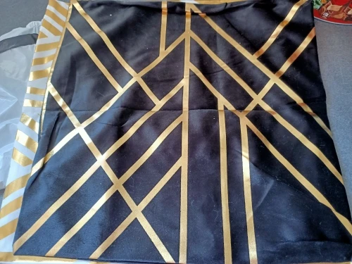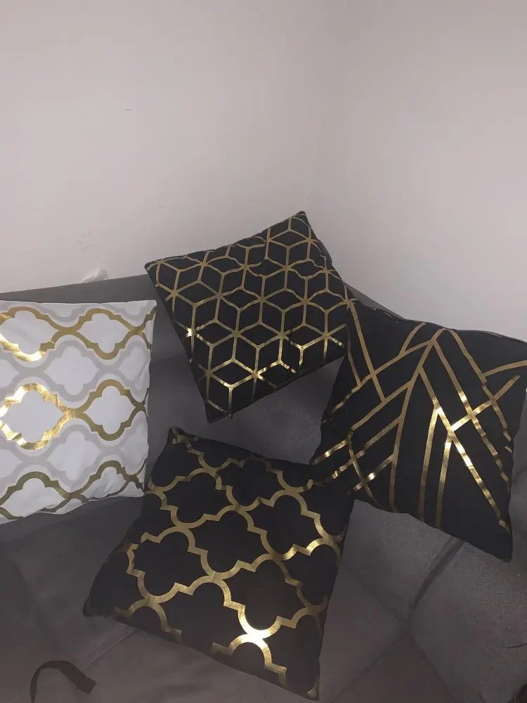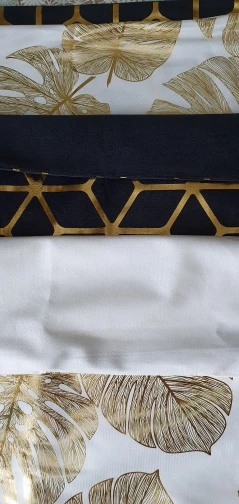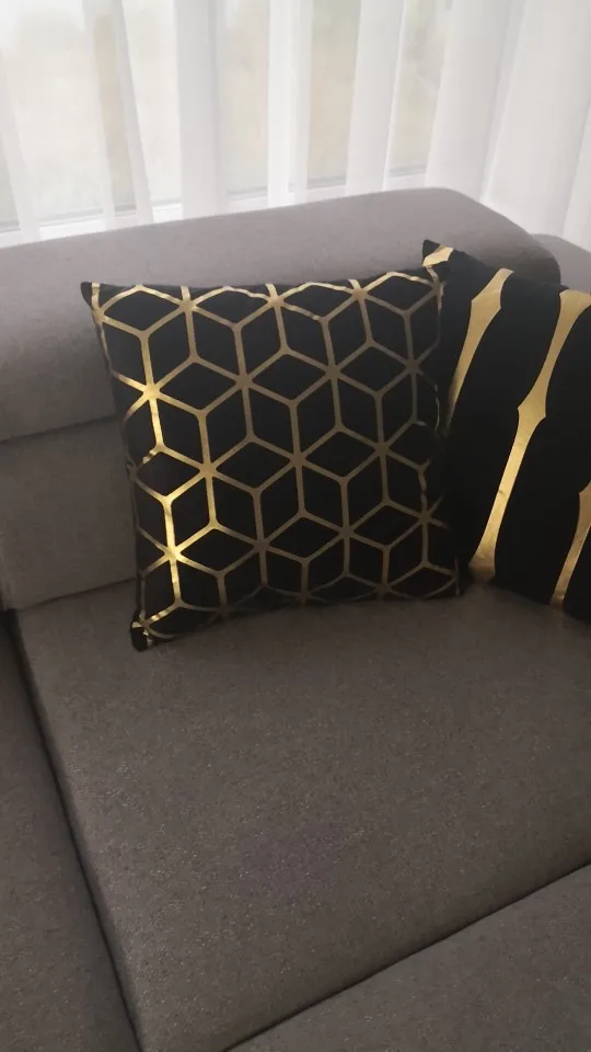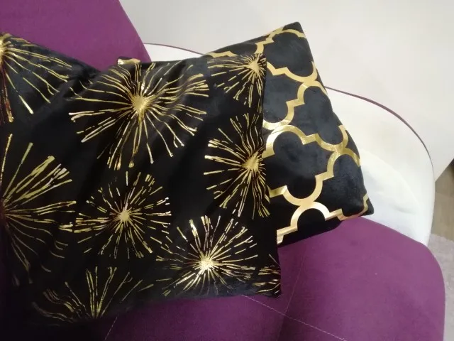 наволочки полностью совпадают с фото и описанием продавца. ооочень красивые. отличный золотой принт. современно и дорого смотрятся. задняя часть выполнена из того же материала, только без принта. заказали сначала по одной чёрной и белой. но подумав дозаказали ещё по одной. чтобы было две белых и две чёрных. продавец объединил заказы.