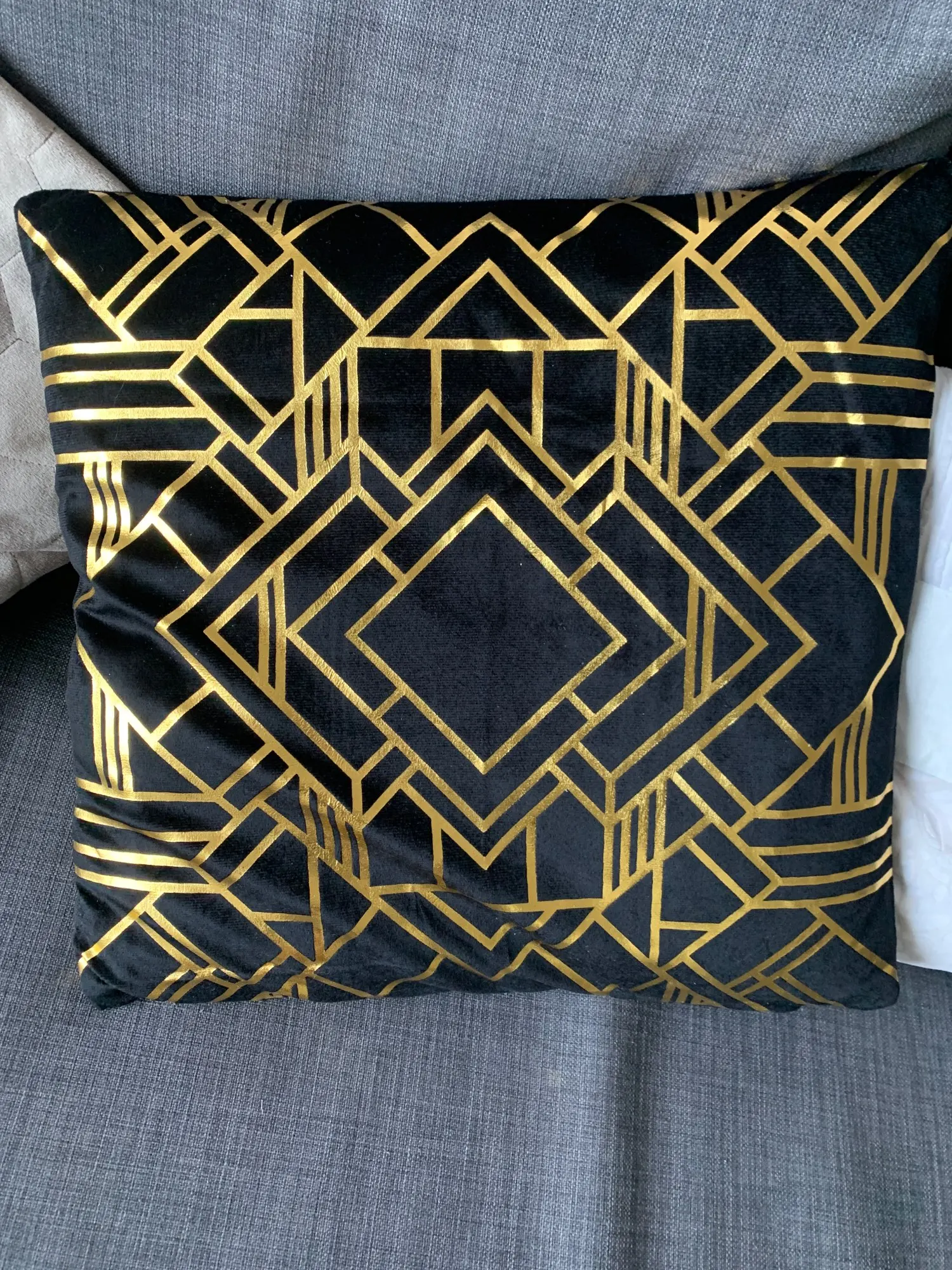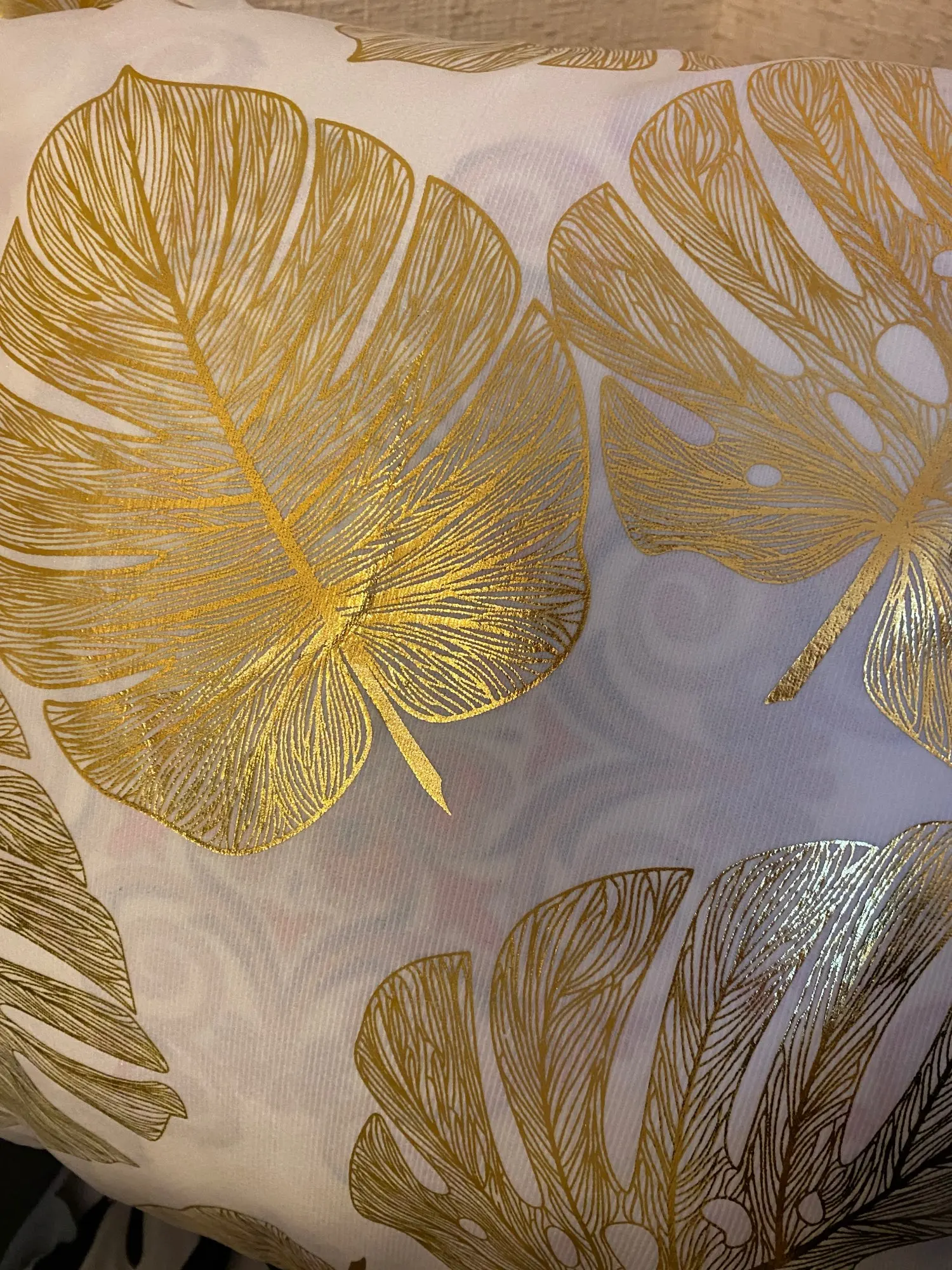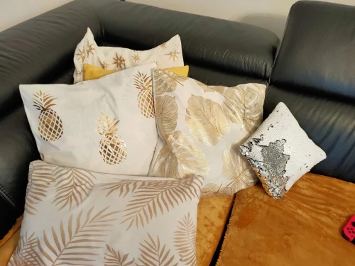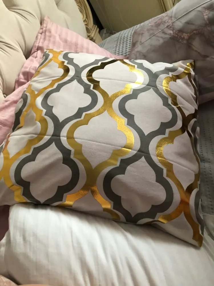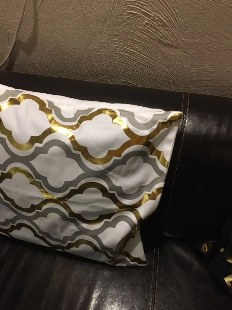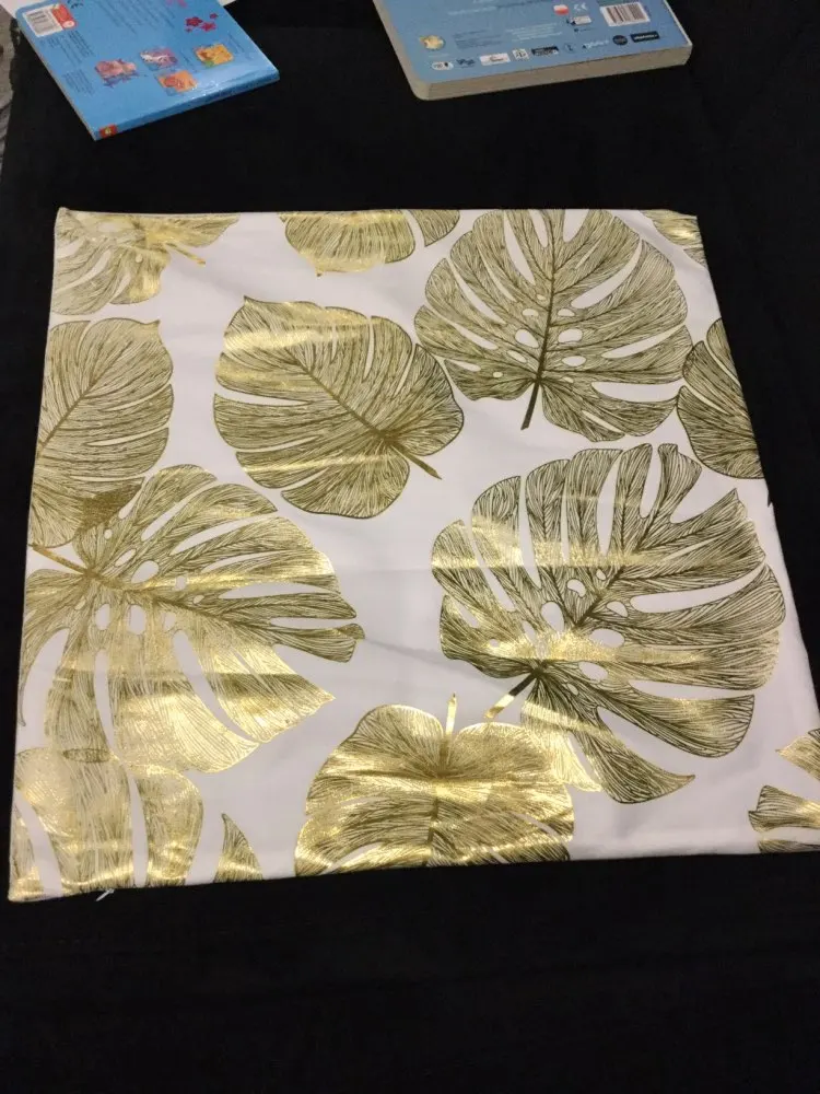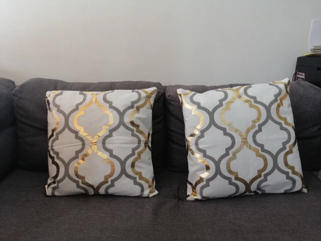 наволочки полностью совпадают с фото и описанием продавца. ооочень красивые. отличный золотой принт. современно и дорого смотрятся. задняя часть выполнена из того же материала, только без принта. заказали сначала по одной чёрной и белой. но подумав дозаказали ещё по одной. чтобы было две белых и две чёрных. продавец объединил заказы.