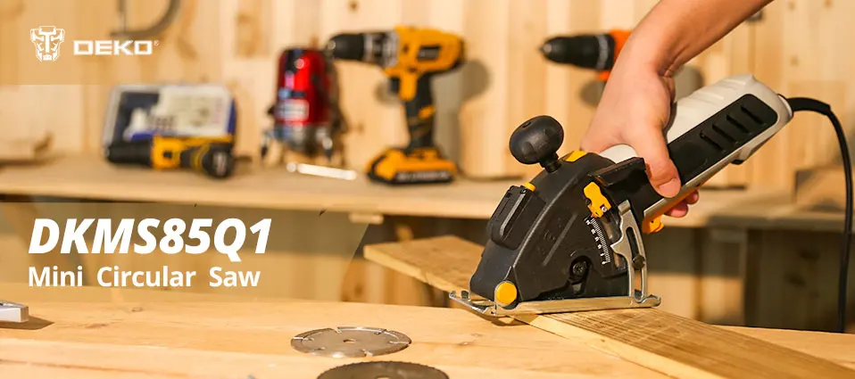 Мини-циркулярная пила DEKO (DKMS85Q1)-мощная и функциональная циркулярная пила. Нет необходимости в громоздкой циркулярной Пиле, когда компактная циркулярная пила режет дерево/дерево-как материалы/пластмассы/плитки/печатных плат/стекловолокна армированного пластика в такое же количество времени с легкостью и комфорт, благодаря легкому и компактному дизайну. С мини-циркулярной пилой DEKO легко, удобно и контролируется, и только одной рукой. И эргономичная ручка управления делает его самым быстрым, простым и самым современным инструментом в вашем ящике инструментов.