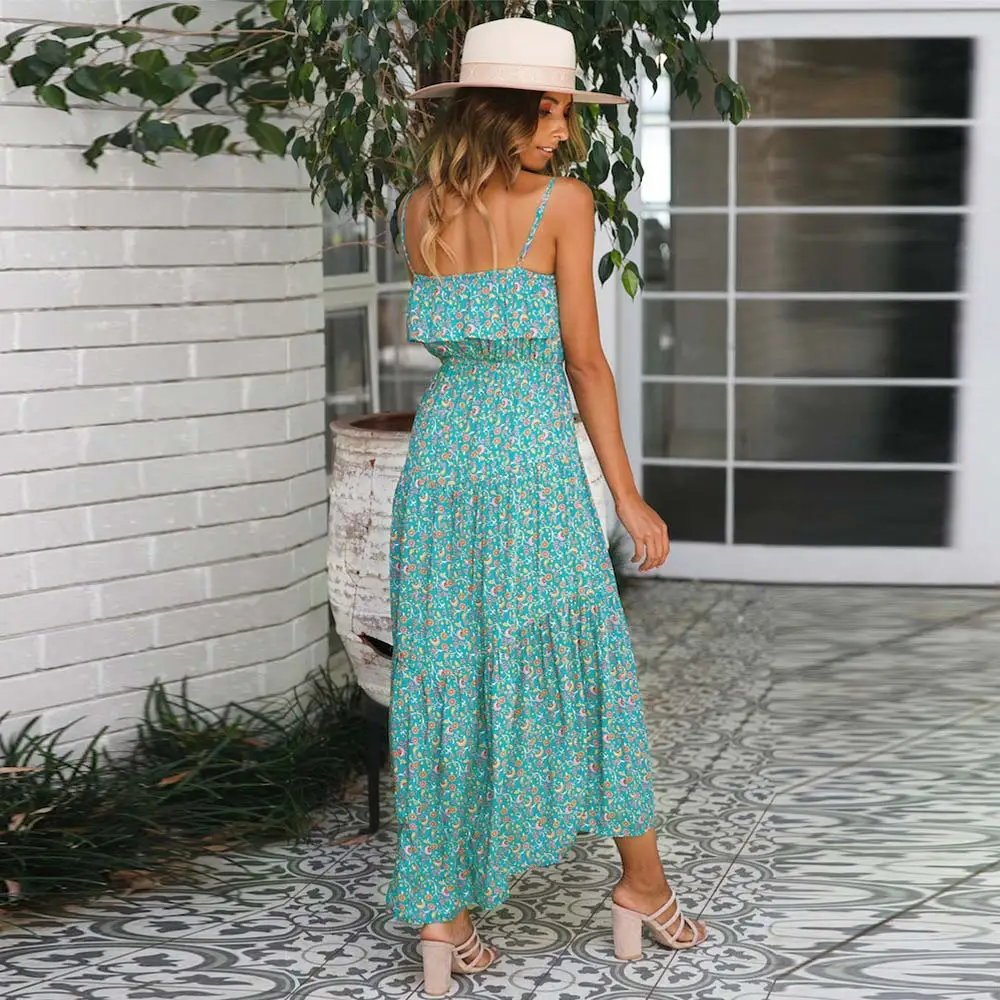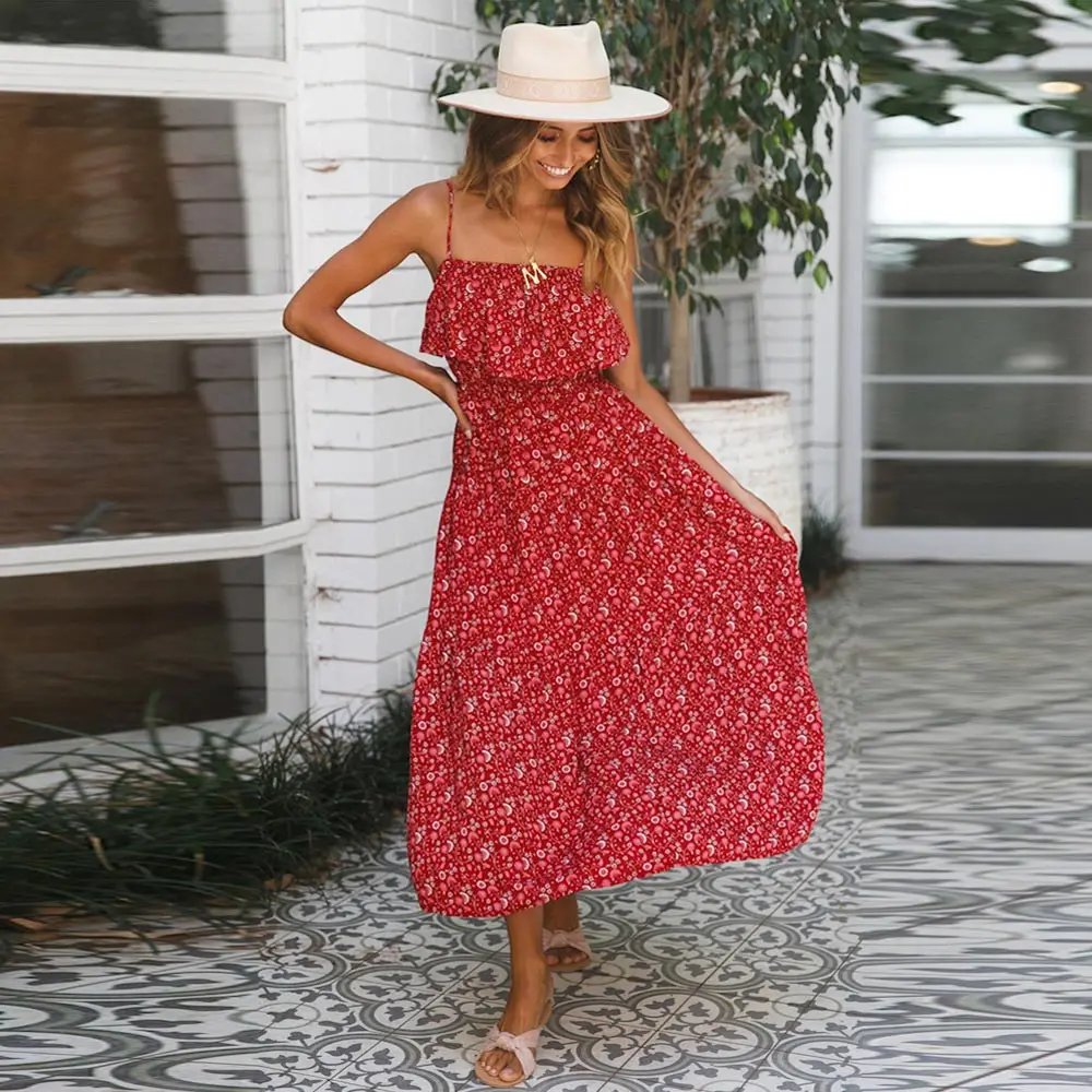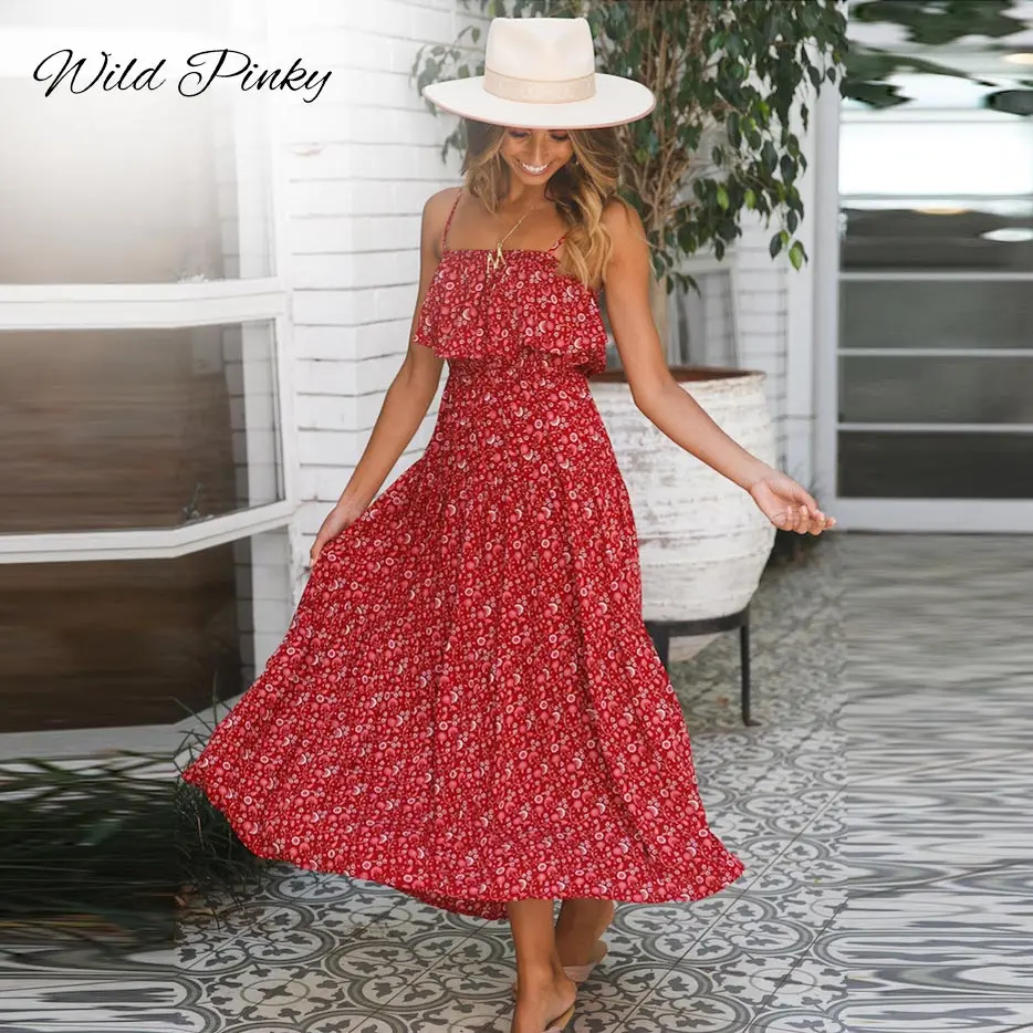 Женское пляжное платье миди в стиле бохо WildPinky, Летнее Длинное платье с цветочным принтом, с оборками, без бретелек, на бретелях